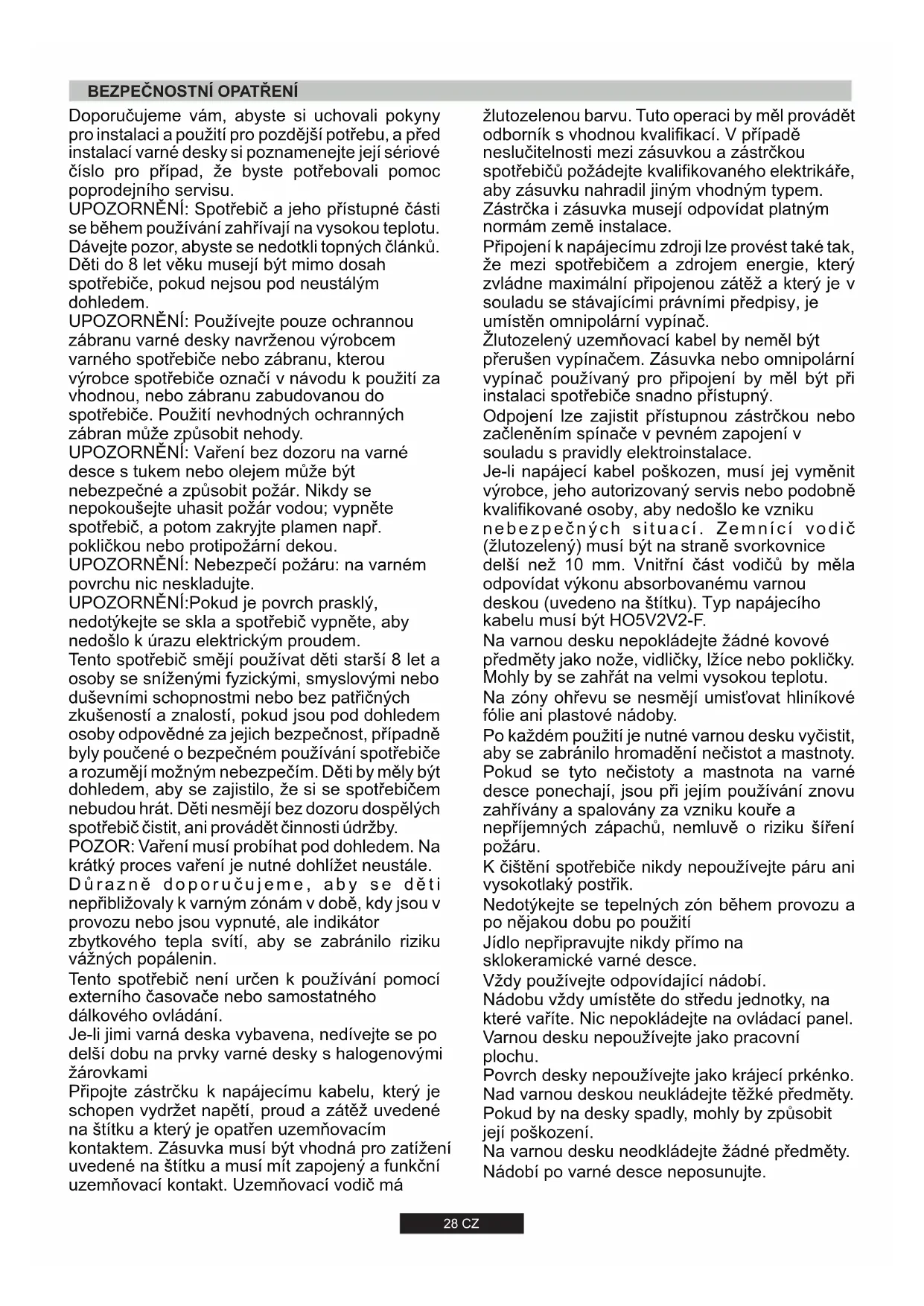 28 CZ Připojení k napájecímu zdroji lze provést také tak, že mezi spotřebičem a zdrojem energie, který zvládne maximální připojenou zátěž a který je v souladu se stávajícími právními předpisy, je umístěn omnipolární vypínač. žlutozelenou barvu. Tuto operaci by měl provádět odborník s vhodnou kvalifikací. V případě neslučitelnosti mezi zásuvkou a zástrčkou spotřebičů požádejte kvalifikovaného elektrikáře, aby zásuvku nahradil jiným vhodným typem. Zástrčka i zásuvka musejí odpovídat platným normám země instalace. Žlutozelený uzemňovací kabel by neměl být přerušen vypínačem. Zásuvka nebo omnipolární vypínač používaný pro připojení by měl být při instalaci spotřebiče snadno přístupný. Je-li napájecí kabel poškozen, musí jej vyměnit výrobce, jeho autorizovaný servis nebo podobně kvalifikované osoby, aby nedošlo ke vzniku ne b e z peč n ý ch s i t u ací . Ze mní c í vodi č (žlutozelený) musí být na straně svorkovnice delší než 10 mm. Vnitřní část vodičů by měla odpovídat výkonu absorbovanému varnou deskou (uvedeno na štítku). Typ napájecího kabelu musí být HO5V2V2-F. Na varnou desku nepokládejte žádné kovové předměty jako nože, vidličky, lžíce nebo pokličky. Mohly by se zahřát na velmi vysokou teplotu. Na zóny ohřevu se nesmějí umisťovat hliníkové fólie ani plastové nádoby. Po každém použití je nutné varnou desku vyčistit, aby se zabránilo hromadění nečistot a mastnoty. Pokud se tyto nečistoty a mastnota na varné desce ponechají, jsou při jejím používání znovu zahřívány a spalovány za vzniku kouře a nepříjemných zápachů, nemluvě o riziku šíření požáru. K čištění spotřebiče nikdy nepoužívejte páru ani vysokotlaký postřik. Nedotýkejte se tepelných zón během provozu a po nějakou dobu po použití Jídlo nepřipravujte nikdy přímo na sklokeramické varné desce. Vždy používejte odpovídající nádobí. Odpojení lze zajistit přístupnou zástrčkou nebo začleněním spínače v pevném zapojení v souladu s pravidly elektroinstalace. Nádobu vždy umístěte do středu jednotky, na které vaříte. Nic nepokládejte na ovládací panel. Varnou desku nepoužívejte jako pracovní plochu. Povrch desky nepoužívejte jako krájecí prkénko. Nádobí po varné desce neposunujte. Na varnou desku neodkládejte žádné předměty. Nad varnou deskou neukládejte těžké předměty. Pokud by na desky spadly, mohly by způsobit její poškození.Při instalaci odsavače par nad v a r n o u d e s k u s e ř i ď t e p ož a d a v k y na in s t a l a c i odsavače par, ale v žádném případě nesmí být vzdálenost m e z i v a r n o u d e s k o u a odsavačem par kratší než 700 mm. Nechte mezi varnou deskou a zadní stěnou mezeru nejméně 55 mm a mezi varnou deskou a vertikálním nábytkem nebo stěnami na boční straně nejméně 150 mm. Pokud je nad varnou deskou instalován n á b y t e k , p o ž a d o v a n á minimální vzdálenost je 700 mm.