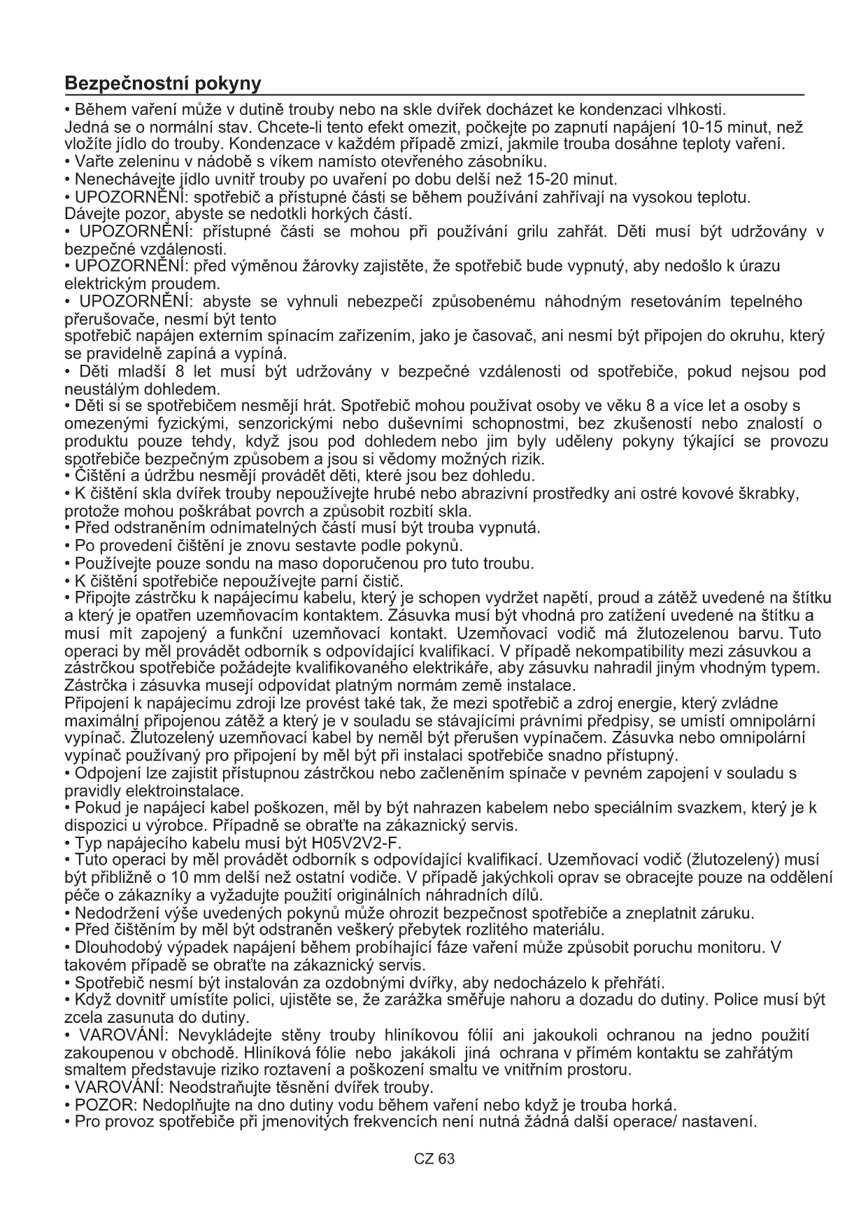 - POZOR: Nedoplňujte na dno dutiny vodu během vaření nebo když je trouba horká. Bezpečnostní pokyny CZ 63CZ 64 Obsah Obecné pokyny
