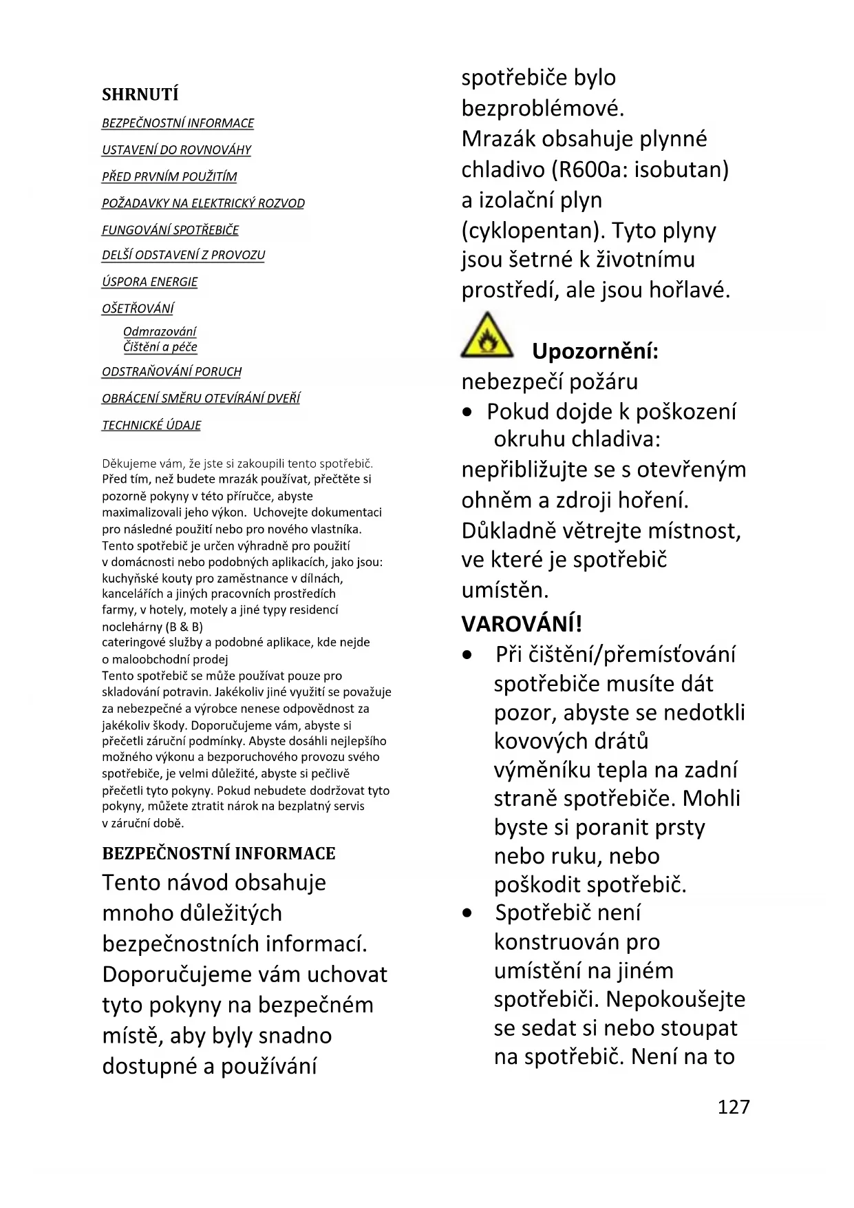Tento návod obsahuje mnoho důležitých bezpečnostních informací. Doporučujeme vám uchovat tyto pokyny na bezpečném místě, aby byly snadno dostupné a používání spotřebiče bylo bezproblémové. Mrazák obsahuje plynné chladivo (R600a: isobutan) a izolační plyn (cyklopentan). Tyto plyny jsou šetrné k životnímu prostředí, ale jsou hořlavé. Upozornění: nebezpečí požáru