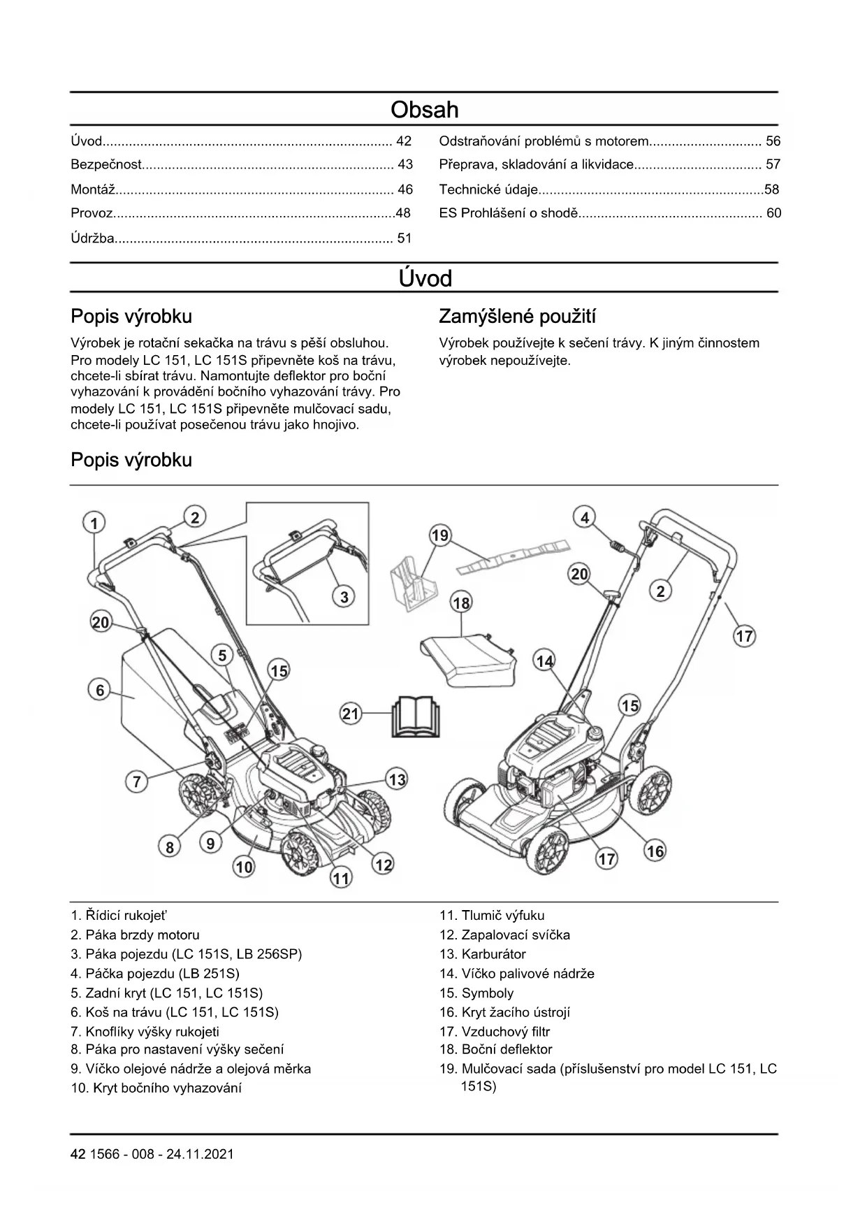 1566 - 008 - 24.11.2021 59ES Prohlášení o shodě ES Prohlášení o shodě Husqvarna AB, SE–561 82 Huskvarna, Švédsko, tel: +46-36-146500, prohlašuje, že sekačka na trávu Husqvarna LC 151, LC 151S, LB 251S, LB 256SP vyrobená v roce 2020 a později splňuje požadavky SMĚRNICE RADY: