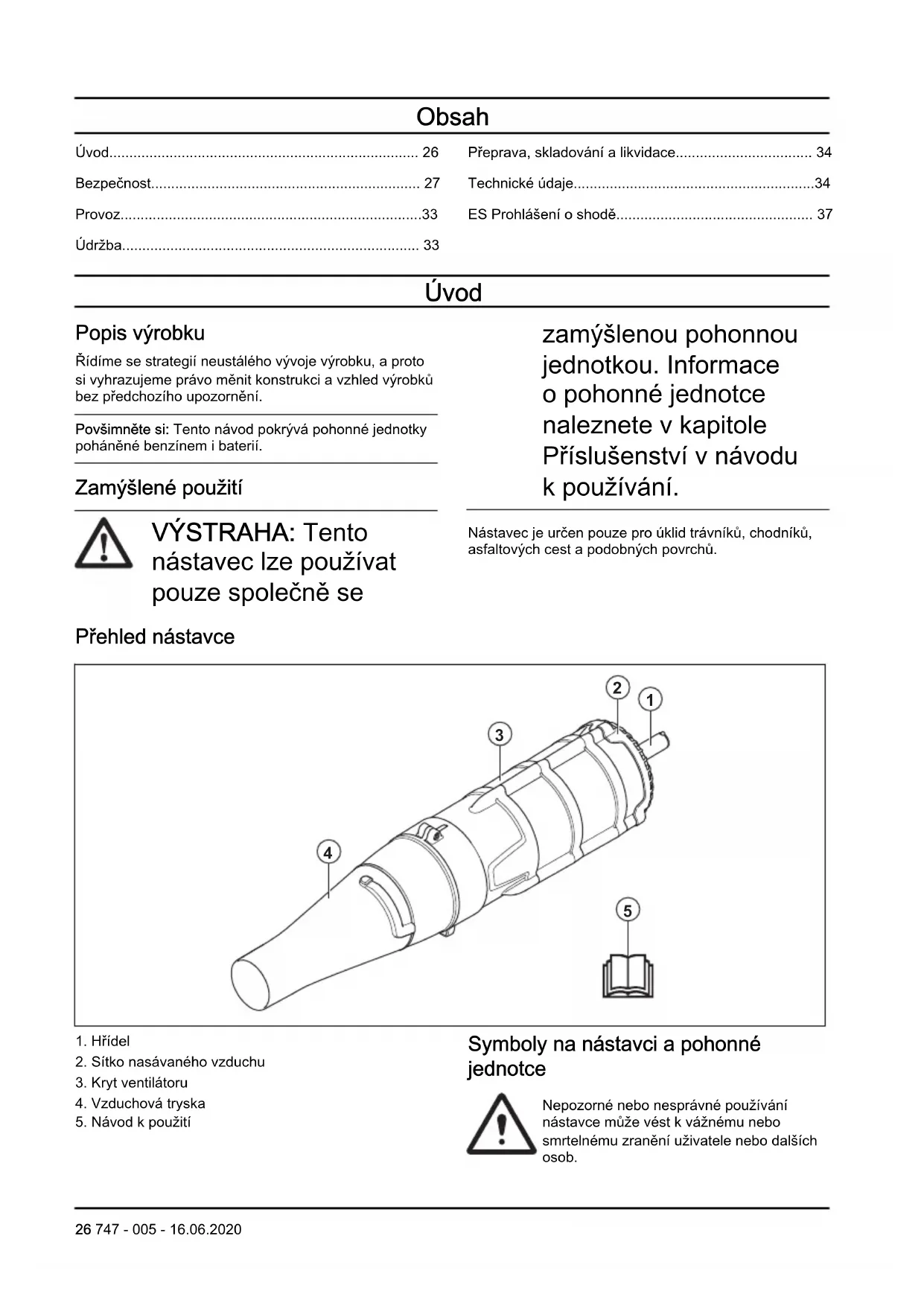 Symboly na nástavci a pohonné jednotce Nepozorné nebo nesprávné používání nástavce může vést k vážnému nebo smrtelnému zranění uživatele nebo dalších osob. 26 747 - 005 - 16.06.2020Pozorně si přečtěte tento návod k používání a předtím, než nástavec začnete používat, se přesvědčte o tom, že pokynům rozumíte. Tento nástavec vyhovuje platným směrnicím ES. Používejte schválenou ochranu sluchu, očí a dýchacích cest. Používejte schválené ochranné rukavice. Emise hluku do okolí dle směrnice Evropského společenství. Emise nástavce jsou uvedeny v kapitole Technické údaje a na štítku. Obsluha foukače musí zajistit, aby se v okruhu 15 metrů nepohybovali lidé ani zvířata. Pokud pracuje několik pracovníků na stejném místě, musí být dodržována bezpečná vzdálenost rozestupů minimálně 15 metrů. Fou- kač může velkou silou odmrštit předměty, které se mohou odrazit zpět. Pokud nepoužíváte doporučené ochranné prostředky, může dojít k vážnému poranění očí. Foukač může velkou silou odmrštit předměty, které se mohou odrazit zpět. Pokud nepoužíváte doporučené ochranné prostředky, může dojít k vážnému poranění očí. Uživatel výrobku je povinen dohlédnout na to, aby se bě- hem práce nevyskytovala žádná osoba nebo zvíře v okruhu 15 metrů od stroje. Useknutí prstů nebo ruky lopatkou ventilátoru. Neotevírejte ani nedemontujte bezpečnostní kryty a sítka, když je motor v chodu. Povšimněte si: Další symboly/štítky na nástavci se týkají zvláštních certifikačních požadavků pro určité obchodní trhy. Bezpečnost Definice týkající se bezpečnosti Varování, upozornění a poznámky slouží jako upozornění na specifické důležité části návodu k používání. VÝSTRAHA: Používá se v případě nebezpečí úrazu nebo usmrcení obsluhy nebo okolních osob, pokud nejsou dodrženy pokyny uvedené v této příručce. VAROVÁNÍ: Používá se v případě nebezpečí poškození výrobku nebo nástavce, dalších materiálů či škod na majetku v blízkém okolí, pokud nejsou dodrženy