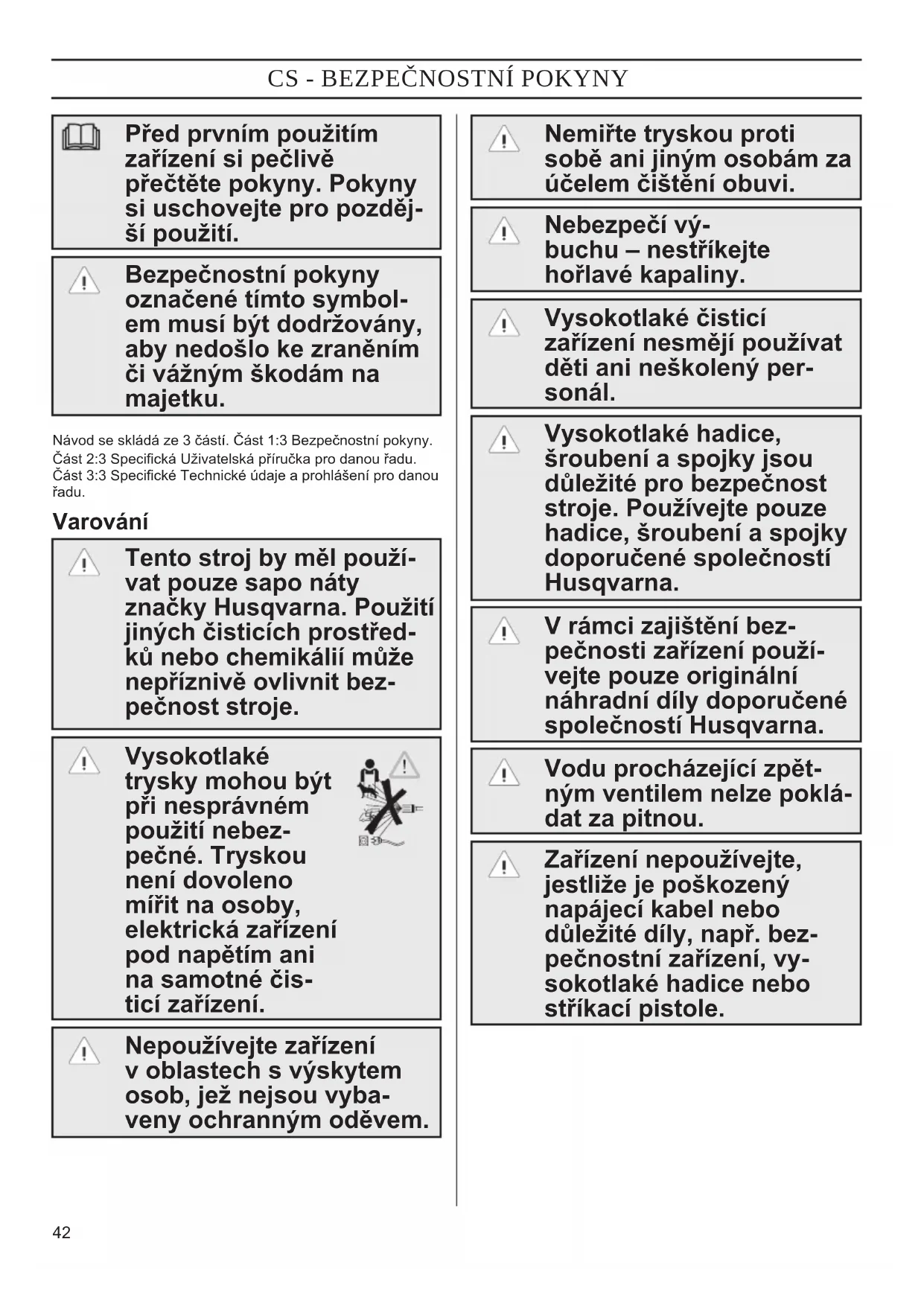 Před prvním použitím zařízení si pečlivě přečtěte pokyny. Pokyny si uschovejte pro pozděj- ší použití. Bezpečnostní pokyny označené tímto symbol- em musí být dodržovány, aby nedošlo ke zraněním či vážným škodám na majetku. Návod se skládá ze 3 částí. Část 1:3 Bezpečnostní pokyny. Část 2:3 Specická Uživatelská příručka pro danou řadu. Část 3:3 Specické Technické údaje a prohlášení pro danou řadu. Varování Tento stroj by měl použí- vat pouze sapo náty značky Husqvarna. Použití jiných čisticích prostřed- ků nebo chemikálií může nepříznivě ovlivnit bez- pečnost stroje. Vysokotlaké trysky mohou být při nesprávném použití nebez- pečné. Tryskou není dovoleno mířit na osoby, elektrická zařízení pod napětím ani na samotné čis- ticí zařízení. Nepoužívejte zařízení v oblastech s výskytem osob, jež nejsou vyba- veny ochranným oděvem. Nemiřte tryskou proti sobě ani jiným osobám za účelem čištění obuvi. Nebezpečí vý- buchu – nestříkejte hořlavé kapaliny. Vysokotlaké čisticí zařízení nesmějí používat děti ani neškolený per- sonál. Vysokotlaké hadice, šroubení a spojky jsou důležité pro bezpečnost stroje. Používejte pouze hadice, šroubení a spojky doporučené společností Husqvarna. V rámci zajištění bez- pečnosti zařízení použí- vejte pouze originální náhradní díly doporučené společností Husqvarna. Vodu procházející zpět- ným ventilem nelze poklá- dat za pitnou. Zařízení nepoužívejte, jestliže je poškozený napájecí kabel nebo důležité díly, např. bez- pečnostní zařízení, vy- sokotlaké hadice nebo stříkací pistole.43