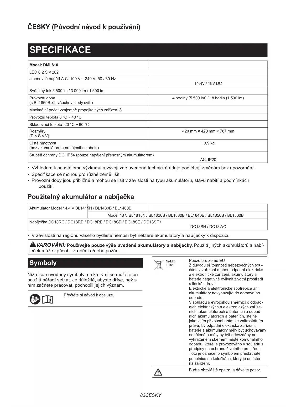 - Originálna batéria a nabíjačka Makita POZNÁMKA: Niektoré položky zo zoznamu môžu byť súčasťou balenia nástrojov vo forme štandardného príslušenstva. Rozsah týchto položiek môže byť v každej krajine odlišný.83 ČESKY ČESKY (Původní návod k používání) SPECIFIKACE Model: DML810 LED 0,2 Š × 202 Jmenovité napětí A.C. 100 V – 240 V, 50 / 60 Hz 14,4V / 18V DC Světelný tok 5 500 lm / 3 000 lm / 1 500 lm Provozní doba (s BL1860B x2, všechny diody svítí) 4 hodiny (5 500 lm) / 18 hodin (1 500 lm) Maximální počet vzájemně propojitelných zařízení 8 Provozní teplota 0 °C ~ 40 °C Skladovací teplota -20 °C ~ 60 °C Rozměry (D × Š × V) 420 mm × 420 mm × 787 mm Čistá hmotnost (bez akumulátoru a napájecího kabelu) 13,9 kg Stupeň ochrany DC: IP54 (pouze napájení přenosným akumulátorem) AC: IP20