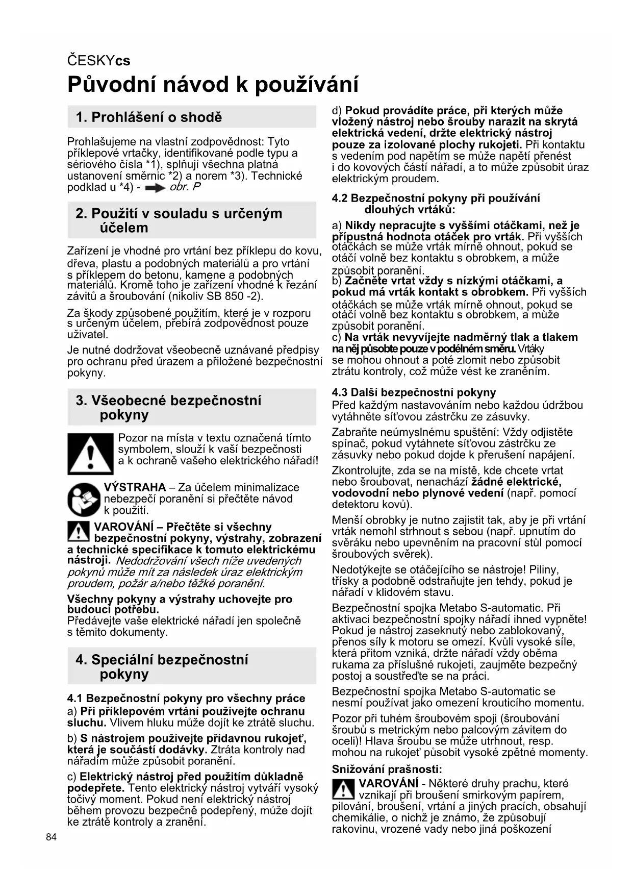 Před každým nastavováním nebo každou údržbou vytáhněte síťovou zástrčku ze zásuvky. Zabraňte neúmyslnému spuštění: Vždy odjistěte spínač, pokud vytáhnete síťovou zástrčku ze zásuvky nebo pokud dojde k přerušení napájení. Zkontrolujte, zda se na místě, kde chcete vrtat nebo šroubovat, nenachází žádné elektrické, vodovodní nebo plynové vedení (např. pomocí detektoru kovů). Menší obrobky je nutno zajistit tak, aby je při vrtání vrták nemohl strhnout s sebou (např. upnutím do svěráku nebo upevněním na pracovní stůl pomocí šroubových svěrek). Nedotýkejte se otáčejícího se nástroje! Piliny, třísky a podobně odstraňujte jen tehdy, pokud je nářadí v klidovém stavu. Bezpečnostní spojka Metabo S-automatic. Při aktivaci bezpečnostní spojky nářadí ihned vypněte! Pokud je nástroj zaseknutý nebo zablokovaný, přenos síly k motoru se omezí. Kvůli vysoké síle, která přitom vzniká, držte nářadí vždy oběma rukama za příslušné rukojeti, zaujměte bezpečný postoj a soustřeďte se na práci. Bezpečnostní spojka Metabo S-automatic se nesmí používat jako omezení krouticího momentu. Pozor při tuhém šroubovém spoji (šroubování šroubů s metrickým nebo palcovým závitem do oceli)! Hlava šroubu se může utrhnout, resp. mohou na rukojeť působit vysoké zpětné momenty. Snižování prašnosti: VAROVÁNÍ - Některé druhy prachu, které vznikají při broušení smirkovým papírem, pilování, broušení, vrtání a jiných pracích, obsahují chemikálie, o nichž je známo, že způsobují rakovinu, vrozené vady nebo jiná poškození