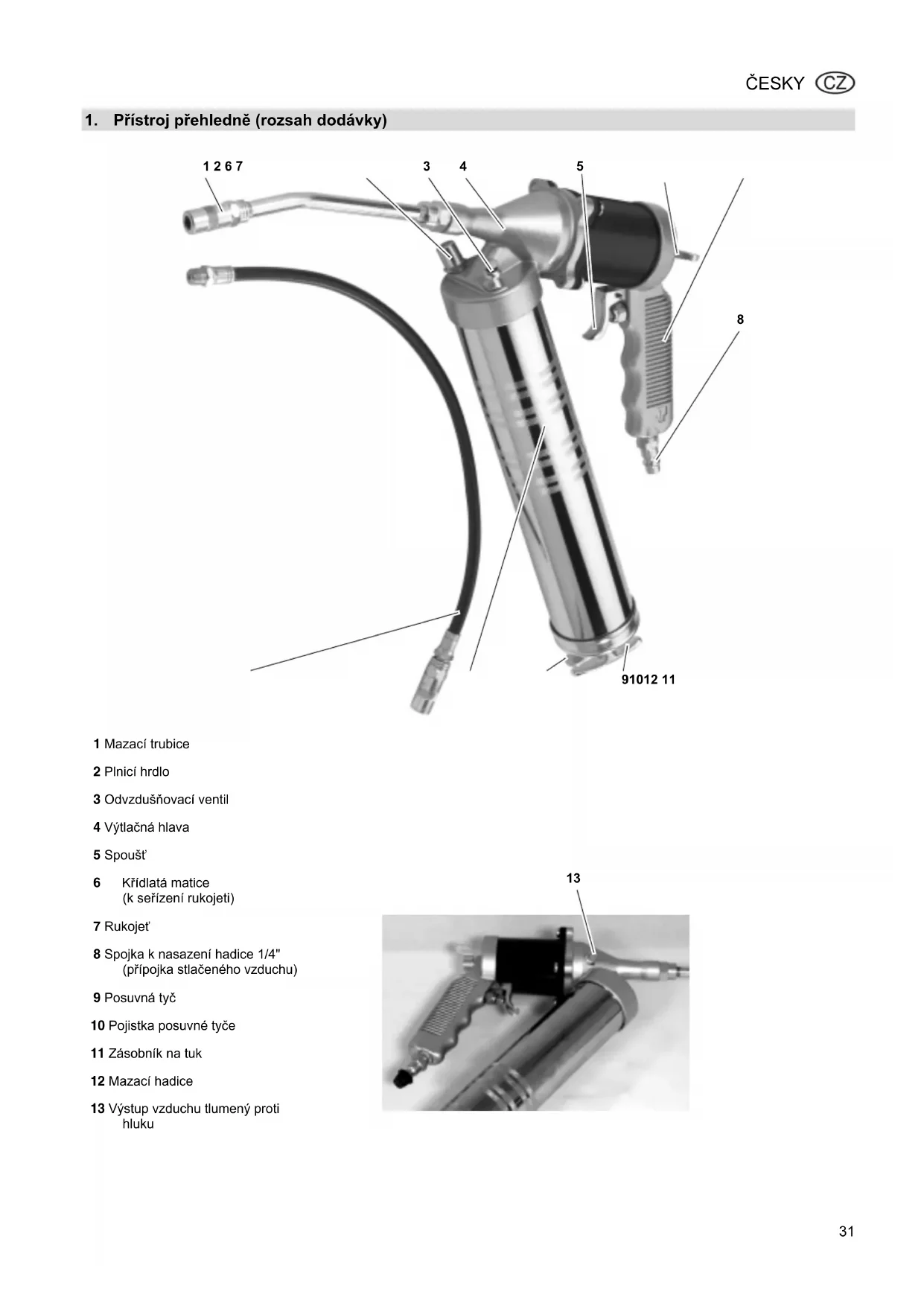 1 Mazací trubice 2 Plnicí hrdlo 3 Odvzdušňovací ventil 4 Výtlačná hlava 5 Spoušť 6 Křídlatá matice (k seřízení rukojeti) 7 Rukojeť 8 Spojka k nasazení hadice 1/4" (přípojka stlačeného vzduchu) 9 Posuvná tyč 10 Pojistka posuvné tyče 11 Zásobník na tuk 12 Mazací hadice 13 Výstup vzduchu tlumený proti hluku
