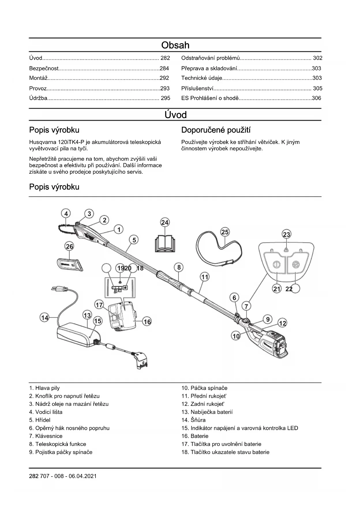 - ES Prohlášení o shodě Úvod Popis výrobku Husqvarna 120iTK4-P je akumulátorová teleskopická vyvětvovací pila na tyči. Nepřetržitě pracujeme na tom, abychom zvýšili vaši bezpečnost a efektivitu při používání. Další informace získáte u svého prodejce poskytujícího servis. Doporučené použití Používejte výrobek ke stříhání větviček. K jiným činnostem výrobek nepoužívejte. Popis výrobku p. 306