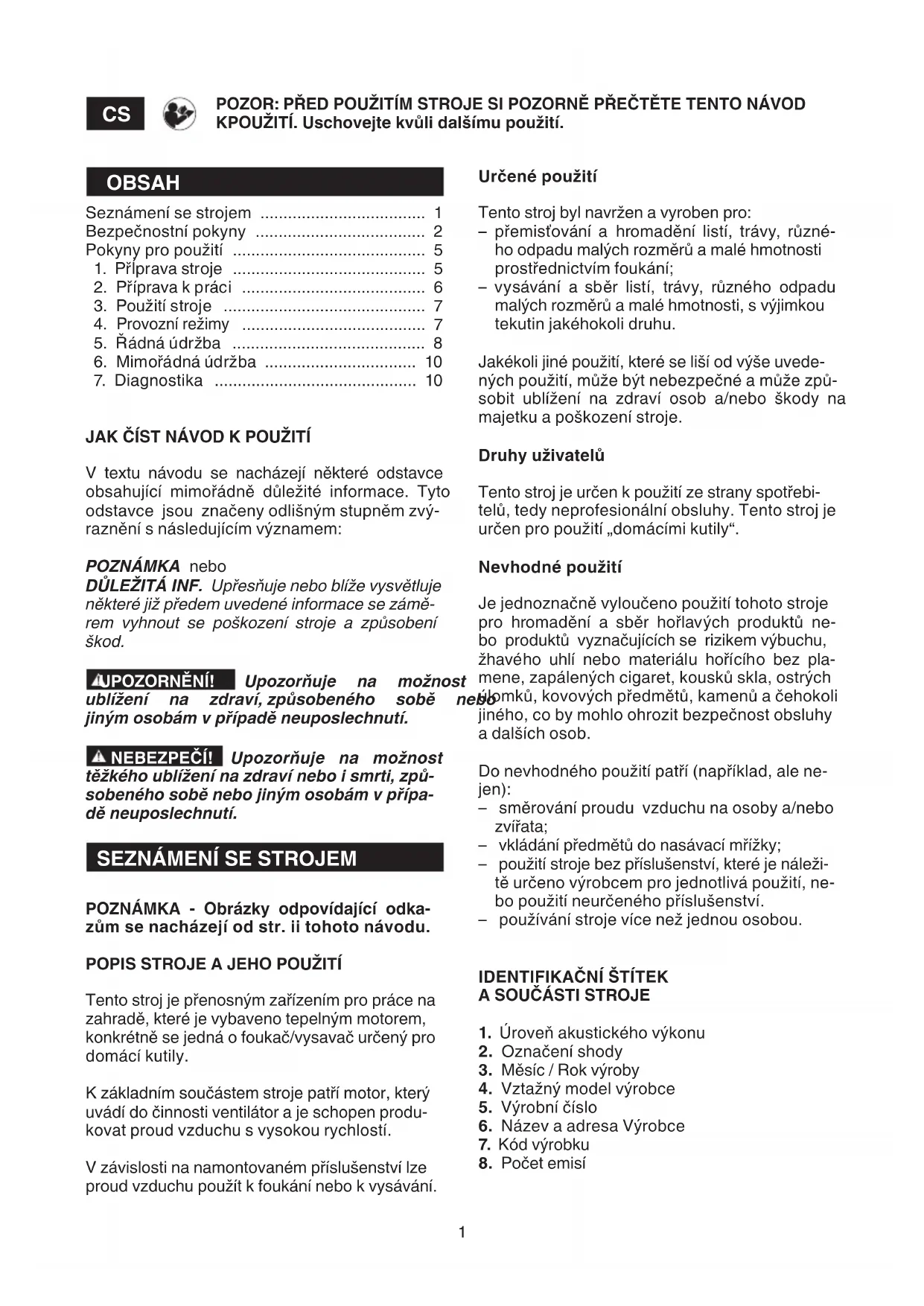1) UPOZORNĚNÍ! Před použitím stroje si pozor-
