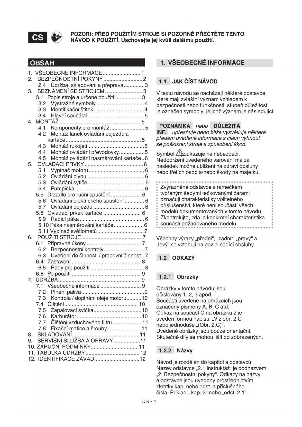 Návod je rozdělen do kapitol a odstavců. Název odstavce „2.1 Instruktáž“ je podnázvem „2. Bezpečnostní pokyny“. Odkazy na názvy a odstavce jsou uvedeny prostřednictvím zkratky kap. nebo odst. a příslušného čísla. Příklad: „kap. 2“ nebo „odst. 2.1”. POZOR!: PŘED POUŽITÍM STROJE SI POZORNĚ PŘEČTĚTE TENTO NÁVOD K POUŽITÍ. Uschovejte jej kvůli dalšímu použití.