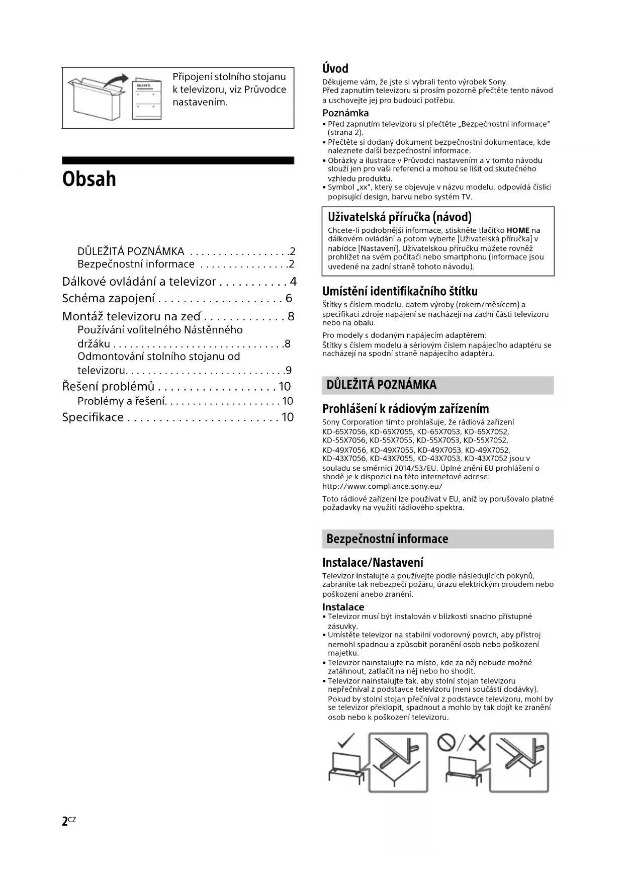 Prohlášení k rádiovým zařízením Sony Corporation tímto prohlašuje, že rádiová zařízení KD-65X7056, KD-65X7055, KD-65X7053, KD-65X7052, KD-55X7056, KD-55X7055, KD-55X7053, KD-55X7052, KD-49X7056, KD-49X7055, KD-49X7053, KD-49X7052, KD-43X7056, KD-43X7055, KD-43X7053, KD-43X7052 jsou v souladu se směrnicí 2014/53/EU. Úplné znění EU prohlášení o shodě je k dispozici na této internetové adrese: http://www.compliance.sony.eu/Toto rádiové zařízení lze používat v EU, aniž by porušovalo platné požadavky na využití rádiového spektra. Bezpečnostní informace Instalace/Nastavení Televizor instalujte a používejte podle následujících pokynů, zabráníte tak nebezpečí požáru, úrazu elektrickým proudem nebo poškození anebo zranění. Instalace