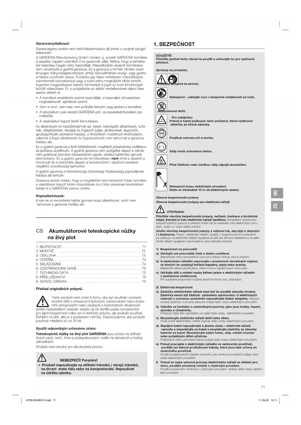 Nevystavujte nabíječku dešti nebo vlhku. Vniknutí vody do elektric- kého přístroje zvyšuje nebezpečí úrazu elektrickým proudem. v Nabíječku udržujte v čistotě. Znečištění zvyšuje riziko úrazu elektrickým proudem. v Před každým použitím zkontrolujte nabíječku, kabel a konektor. Pokud zjistíte nějaké poškození, nabíječku nepoužívejte. Sami nabí- ječku neotvírejte a nechte ji opravit pouze kvalifikovaným odborným personálem a pouze s použitím originálních náhradních dílů. Poškoze- né nabíječky, kabely a konektory zvyšují riziko úrazu elektrickým proudem. v Nabíječku neprovozujte na snadno zápalném podkladu (např. papír, textil atd.) resp. v hořlavém prostředí. Teplo, které se při nabíjení vyvíjí, znamená riziko požáru. v Pokud je nutná výměna napájecího kabelu, musí být provedena servisem GARDENA nebo servisem autorizovaným pro elektrické přístroje GARDENA, aby bylo vyloučeno ohrožení bezpečnosti. 14732-20.960.01.indd 72 11.09.20 12:11CS