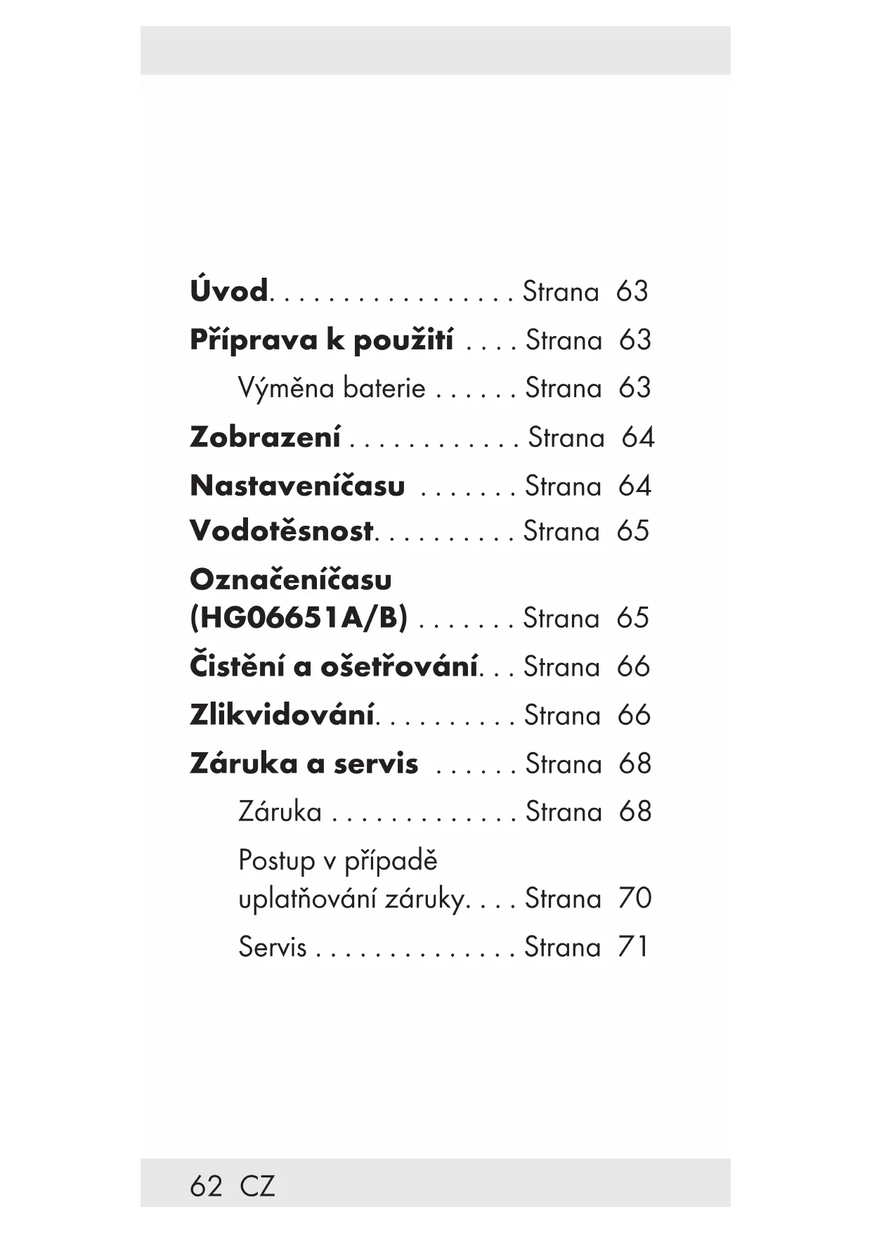 Úvod Blahopřejeme Vám ke koupi nového výrobku. Rozhodli jste se pro kvalitní produkt. Návod k obsluze je součástí tohoto výrobku. Obsahuje důležité pokyny pro bezpečnost, použití a likvidaci. Před použitím výrobku se seznamte se všemi pokyny k obsluze a bezpečnostními pokyny. Používejte výrobek jen popsaným způsobem a na uvedených místech. Při předání výrobku třetí osobě předejte i všechny podklady. Příprava k použití Výměna baterie Poznámka: Nechte si baterie vyměnit ve specializovaném obchodě.64 CZ Zobrazení