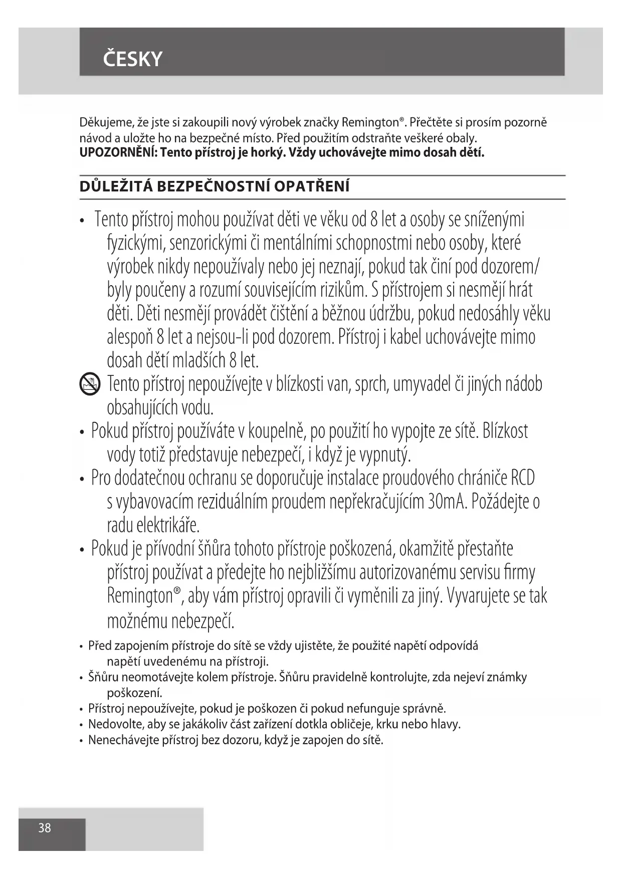 AE38 ČESKY Děkujeme, že jste si zakoupili nový výrobek značky Remington®. Přečtěte si prosím pozorně návod a uložte ho na bezpečné místo. Před použitím odstraňte veškeré obaly. UPOZORNĚNÍ: Tento přístroj je horký. Vždy uchovávejte mimo dosah dětí. DŮLEŽITÁ BEZPEČNOSTNÍ OPATŘENÍ
