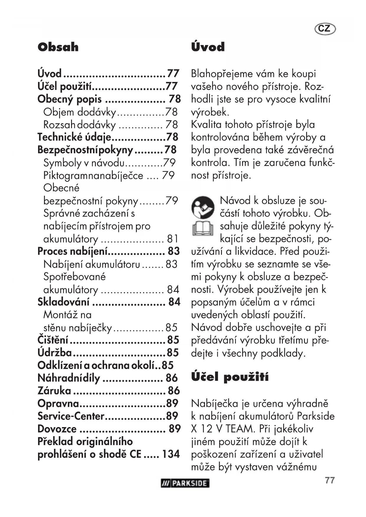 - Úvod Blahopřejeme vám ke koupi vašeho nového přístroje. Roz- hodli jste se pro vysoce kvalitní výrobek. Kvalita tohoto přístroje byla kontrolována během výroby a byla provedena také závěrečná kontrola. Tím je zaručena funkč- nost přístroje. Návod k obsluze je sou- částí tohoto výrobku. Ob- sahuje důležité pokyny tý- kající se bezpečnosti, po- užívání a likvidace. Před použi- tím výrobku se seznamte se vše- mi pokyny k obsluze a bezpeč- nosti. Výrobek používejte jen k popsaným účelům a v rámci uvedených oblastí použití. Návod dobře uschovejte a při předávání výrobku třetímu pře- dejte i všechny podklady. Účel použití Nabíječka je určena výhradně k nabíjení akumulátorů Parkside X12VTEAM. Při jakékoliv jiném použití může dojít k poškození zařízení a uživatel může být vystaven vážnému Překlad originálního prohlášení o shodě CE p. 134