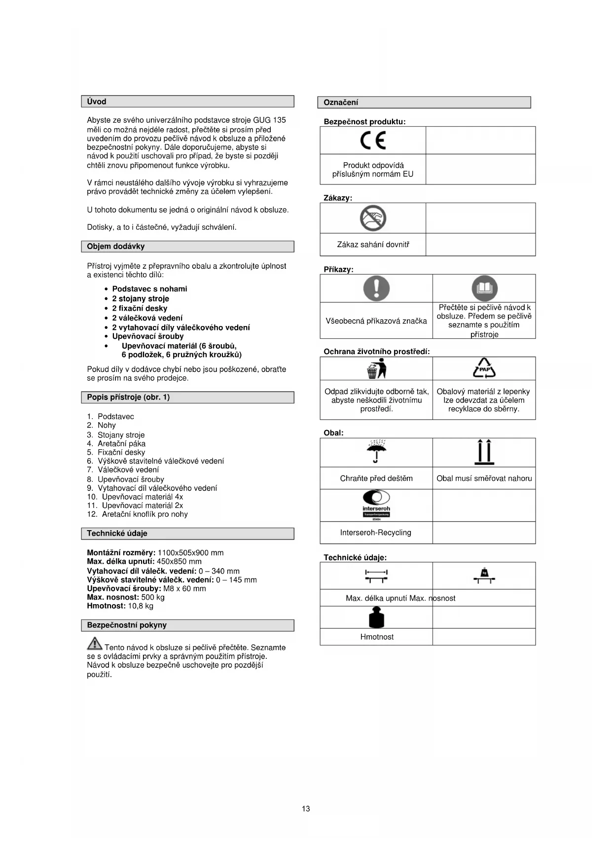 N° de commande : #94713 Directives applicables de la CE: 20006/42 EG Date/signature du fabricant : 12.12.2011 Titre du signataire : gérant Monsieur Arnold Documents techniques : J. Bürkle FBL; QS 12Úvod Abyste ze svého univerzálního podstavce stroje GUG 135 měli co možná nejdéle radost, přečtěte si prosím před uvedením do provozu pečlivě návod k obsluze a přiložené bezpečnostní pokyny. Dále doporučujeme, abyste si návod k použití uschovali pro případ, že byste si později chtěli znovu připomenout funkce výrobku. V rámci neustálého dalšího vývoje výrobku si vyhrazujeme právo provádět technické změny za účelem vylepšení. U tohoto dokumentu se jedná o originální návod k obsluze. Dotisky, a to i částečné, vyžadují schválení. Objem dodávky Přístroj vyjměte z přepravního obalu a zkontrolujte úplnost a existenci těchto dílů: