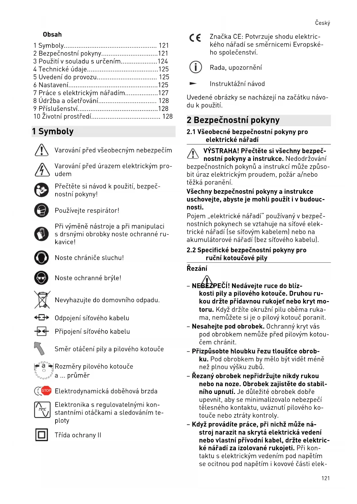 - 10 Životní prostředí 1 Symboly Varování před všeobecným nebezpečím Varování před úrazem elektrickým pro udem Přečtěte si návod k použití, bezpeč nostní pokyny! Používejte respirátor! Při výměně nástroje a při manipulaci s drsnými obrobky noste ochranné ru kavice! Noste chrániče sluchu! Noste ochranné brýle! Nevyhazujte do domovního odpadu. Odpojení síťového kabelu Připojení síťového kabelu Směr otáčení pily a pilového kotouče Rozměry pilového kotouče a průměr STOP Elektrodynamická doběhová brzda Elektronika s regulovatelnými kon stantními otáčkami a sledováním te ploty Třída ochrany II Značka CE: Potvrzuje shodu elektric kého nářadí se směrnicemi Evropské ho společenství. Rada, upozornění Instruktážní návod Uvedené obrázky se nacházejí na začátku návo du k použití. 2 Bezpečnostní pokyny p. 128