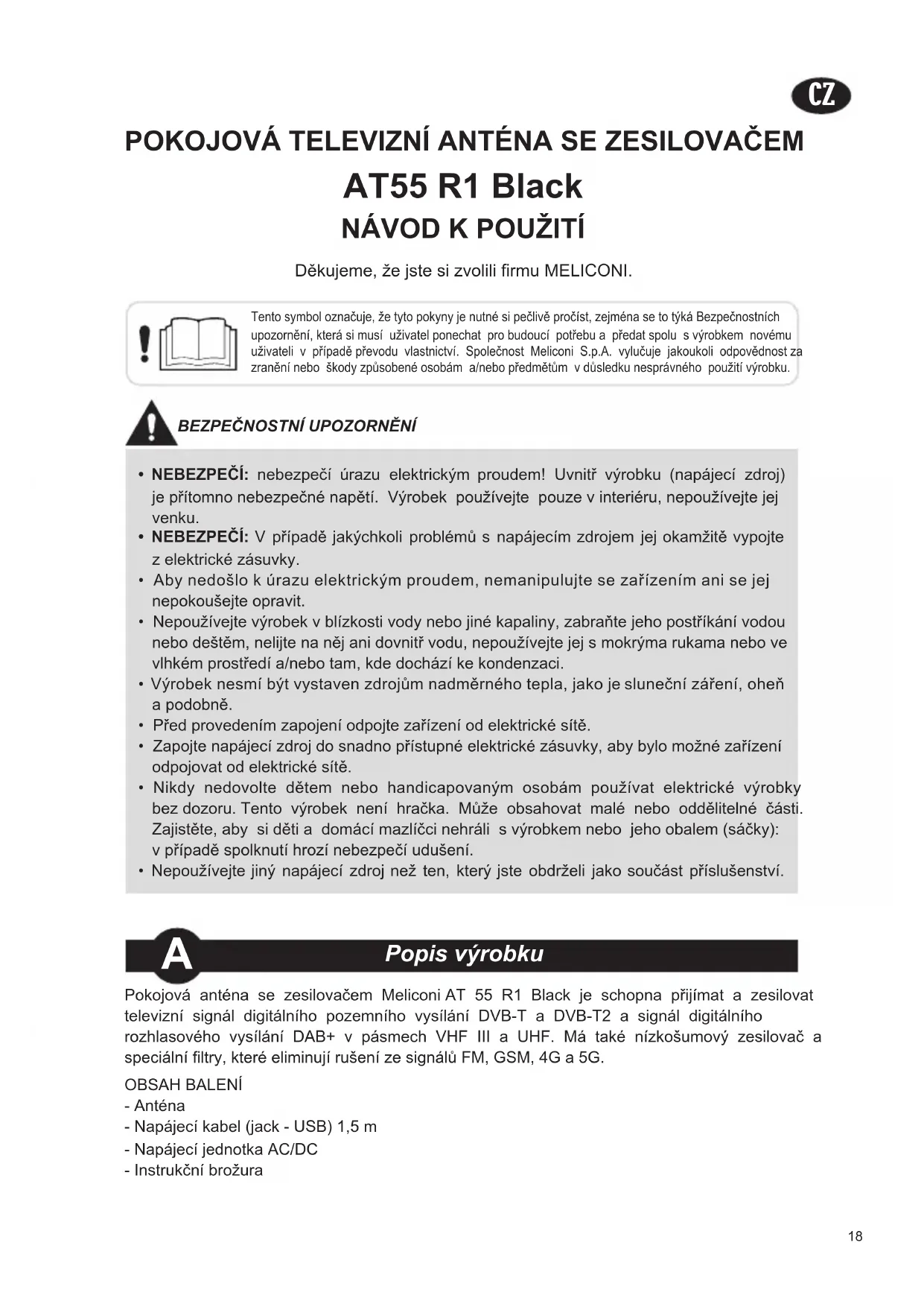 Děkujeme, že jste si zvolili rmu MELICONI. Pokojová anténa se zesilovačem Meliconi AT 55 R1 Black je schopna přijímat a zesilovat televizní signál digitálního pozemního vysílání DVB-T a DVB-T2 a signál digitálního rozhlasového vysílání DAB+ v pásmech VHF III a UHF. Má také nízkošumový zesilovač a speciální ltry, které eliminují rušení ze signálů FM, GSM, 4G a 5G. OBSAH BALENÍ - Anténa - Napájecí kabel (jack - USB) 1,5 m- Napájecí jednotka AC/DC - Instrukční brožura
