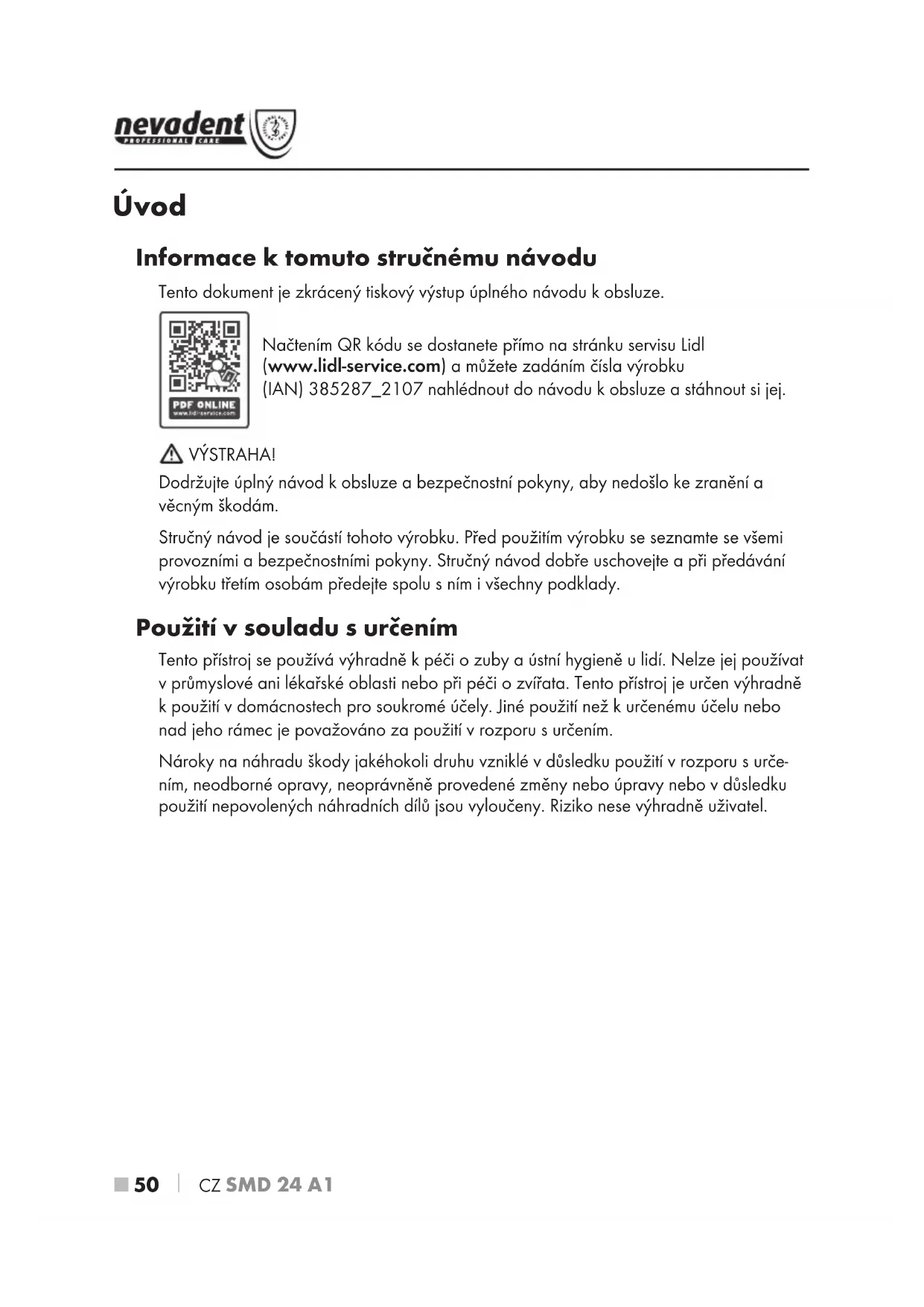 Úvod Informace k tomuto stručnému návodu Tento dokument je zkrácený tiskový výstup úplného návodu k obsluze. Načtením QR kódu se dostanete přímo na stránku servisu Lidl (www.lidl-service.com) a můžete zadáním čísla výrobku (IAN) 385287_2107 nahlédnout do návodu k obsluze a stáhnout si jej. VÝSTRAHA! Dodržujte úplný návod k obsluze a bezpečnostní pokyny, aby nedošlo ke zranění a věcným škodám. Stručný návod je součástí tohoto výrobku. Před použitím výrobku se seznamte se všemi provozními a bezpečnostními pokyny. Stručný návod dobře uschovejte a při předávání výrobku třetím osobám předejte spolu sním ivšechny podklady. Použití vsouladu surčením Tento přístroj se používá výhradně k péči o zuby a ústní hygieně u lidí. Nelze jej používat v průmyslové ani lékařské oblasti nebo při péči o zvířata. Tento přístroj je určen výhradně kpoužití vdomácnostech pro soukromé účely. Jiné použití než kurčenému účelu nebo nad jeho rámec je považováno za použití vrozporu surčením. Nároky na náhradu škody jakéhokoli druhu vzniklé vdůsledku použití vrozporu surče- ním, neodborné opravy, neoprávněně provedené změny nebo úpravy nebo vdůsledku použití nepovolených náhradních dílů jsou vyloučeny. Riziko nese výhradně uživatel. IB_385287_SMD24A1_LB8-short.indb 50IB_385287_SMD24A1_LB8-short.indb 50 27.10.2021 11:37:1227.10.2021 11:37:12CZ
