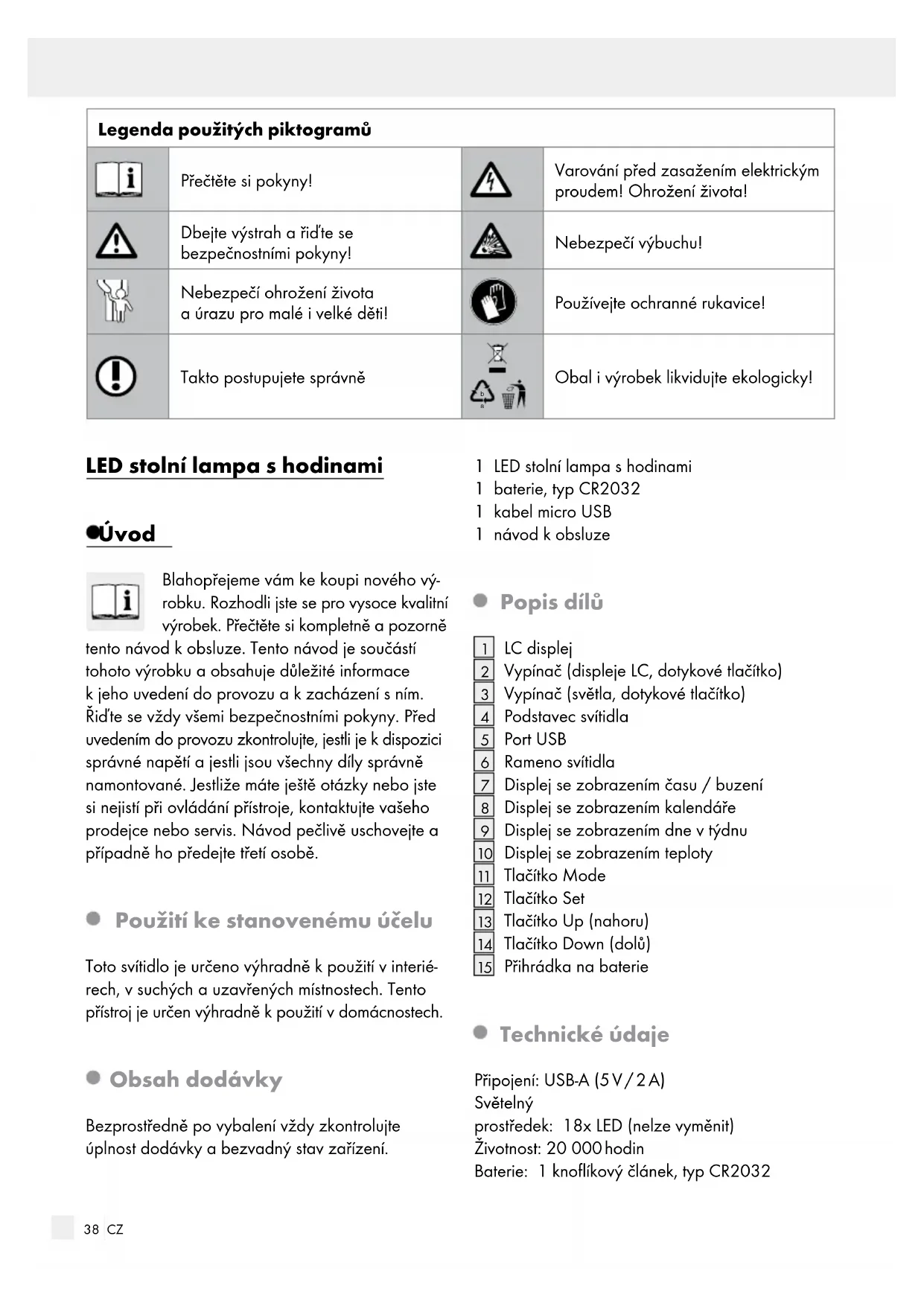 Přihrádka na baterie Technické údaje Připojení: USB-A (5 V / 2 A) Světelný prostředek: 18x LED (nelze vyměnit) Životnost: 20000 hodin Baterie: 1knoflíkový článek, typ CR203239 CZ Rozměry: ø podstavce svítidla: 90 mm Horní rameno svítidla: 192 x 40 x 12,5 mm Výška sramenem ve vodorovné poloze: 260 mm Výška svytaženým ramenem: 430 mm Materiál: plast (kov vpodstavci svítidla) Bezpečnost Bezpečnostní upozornění Vpřípadě poškození, která jsou způsobena nedo- držením tohoto návodu kobsluze, zaniká nárok na záruku! Za následné škody nelze přebrat žádné ručení! Za hmotné škody nebo úrazy osob, způsobené ne- správnou manipulací nebo nedodržováním bez- pečnostních pokynů, nepřebíráme žádné ručení! NEBEZPEČÍ