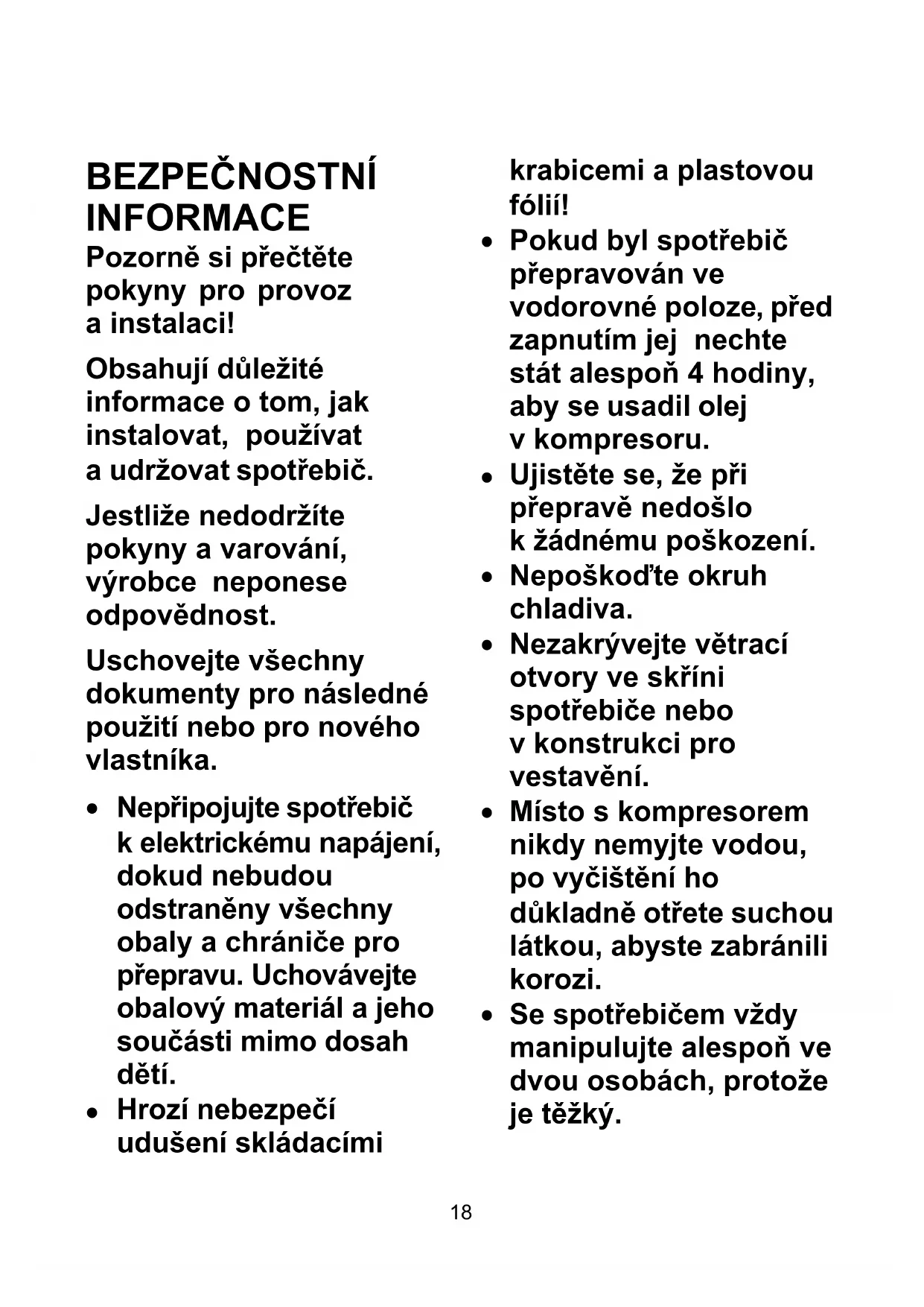 BEZPEČNOSTNÍ INFORMACE Pozorně si přečtěte pokyny pro provoz a instalaci! Obsahují důležité informace o tom, jak instalovat, používat a udržovat spotřebič. Jestliže nedodržíte pokyny a varování, výrobce neponese odpovědnost. Uschovejte všechny dokumenty pro následné použití nebo pro nového vlastníka.