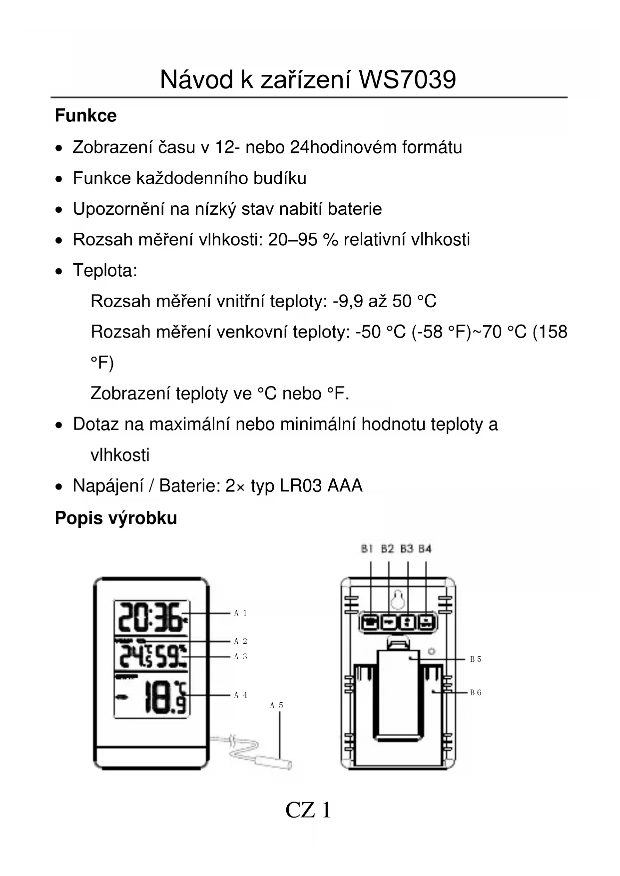 Questo simbolo indica che i dispositivi elettrici alla fine del loro ciclo di vita devono essere smaltiti separatamente dai rifiuti domestici generali. Portare l'unità al proprio punto di raccolta rifiuti locale o a un centro di riciclaggio. Questa disposizione si applica a tutti i paesi dell’Unione europea e agli altri paesi europei in cui viene praticata la raccolta differenziata.CZ 1 Návod k zařízení WS7039 Funkce Zobrazení času v 12- nebo 24hodinovém formátu Funkce každodenního budíku Upozornění na nízký stav nabití baterie Rozsah měření vlhkosti: 20–95 % relativní vlhkosti Teplota: Rozsah měření vnitřní teploty: -9,9 až 50 °C Rozsah měření venkovní teploty: -50 °C (-58 °F)~70 °C (158 °F) Zobrazení teploty ve °C nebo °F. Dotaz na maximální nebo minimální hodnotu teploty a vlhkosti Napájení / Baterie: 2× typ LR03 AAA Popis výrobku