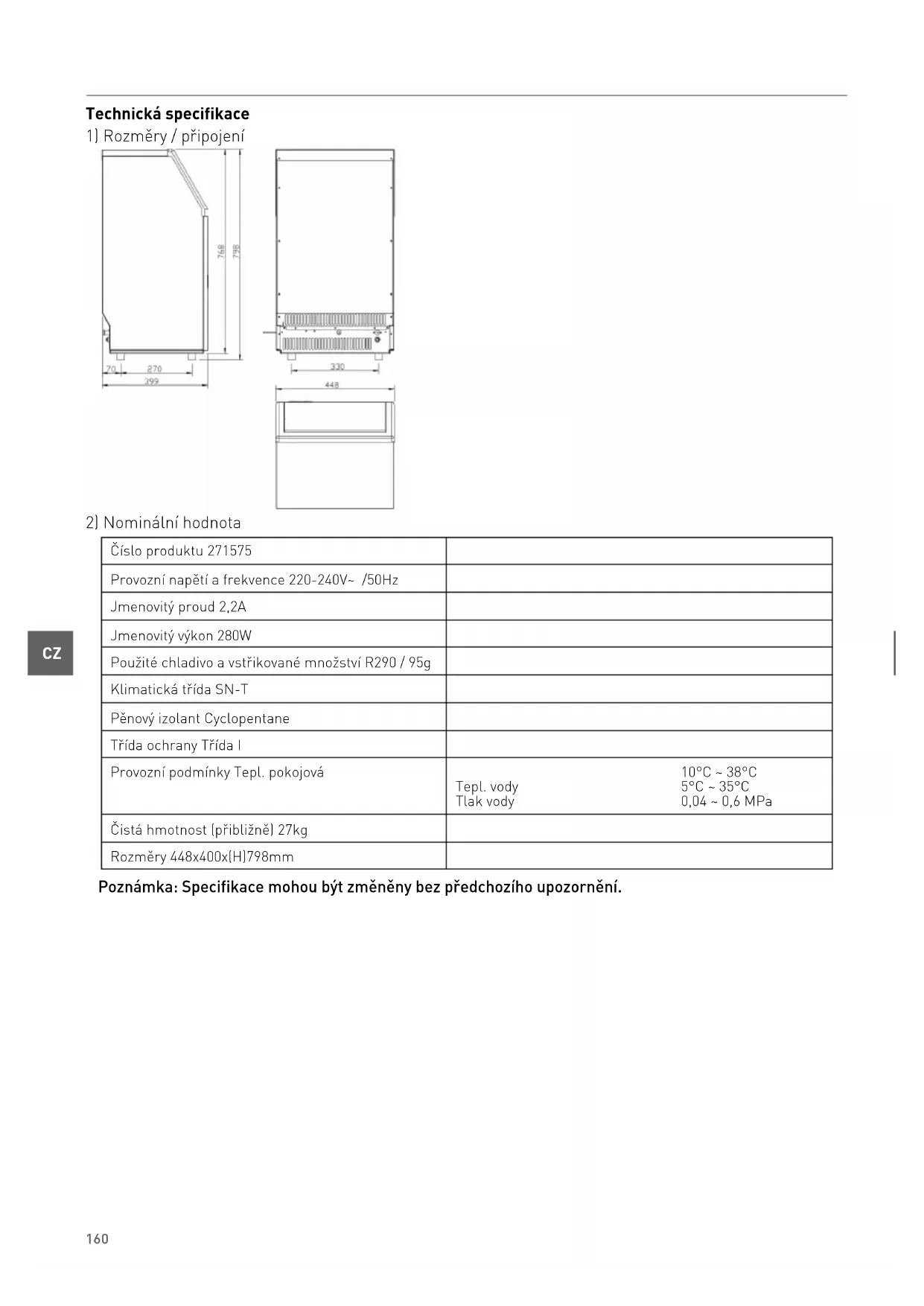 Číslo produktu 271575 Provozní napětí a frekvence 220-240V~ /50Hz Jmenovitý proud 2,2A Jmenovitý výkon 280W Použité chladivo a vstřikované množství R290 / 95g Klimatická třída SN-T Pěnový izolant Cyclopentane Třída ochrany Třída I Provozní podmínky Tepl. pokojová Tepl. vody Tlak vody 10°C ~ 38°C 5°C ~ 35°C 0,04 ~ 0,6 MPa Čistá hmotnost (přibližně) 27kg Rozměry 448x400x(H)798mm Poznámka: Specifikace mohou být změněny bez předchozího upozornění.161