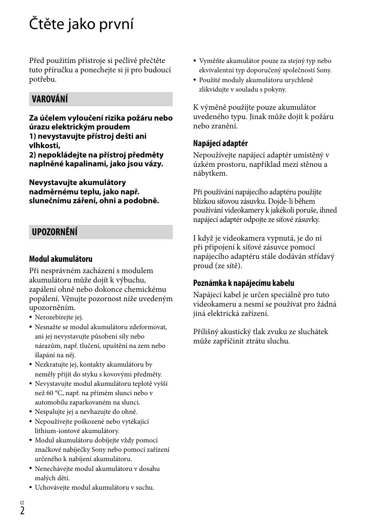 Vyměňte akumulátor pouze za stejný typ nebo ekvivalentní typ doporučený společností Sony. Použité moduly akumulátoru urychleně zlikvidujte v souladu s pokyny. K výměně použijte pouze akumulátor uvedeného typu. Jinak může dojít k požáru nebo zranění. Napájecí adaptér Nepoužívejte napájecí adaptér umístěný v úzkém prostoru, například mezi stěnou a nábytkem. Při používání napájecího adaptéru použijte blízkou síťovou zásuvku. Dojde-li během používání videokamery k jakékoli poruše, ihned napájecí adaptér odpojte ze síťové zásuvky. I když je videokamera vypnutá, je do ní při připojení k síťové zásuvce pomocí napájecího adaptéru stále dodáván střídavý proud (ze sítě). Poznámka k napájecímu kabelu Napájecí kabel je určen speciálně pro tuto videokameru a nesmí se používat pro žádná jiná elektrická zařízení. Přílišný akustický tlak zvuku ze sluchátek může zapříčinit ztrátu sluchu.
