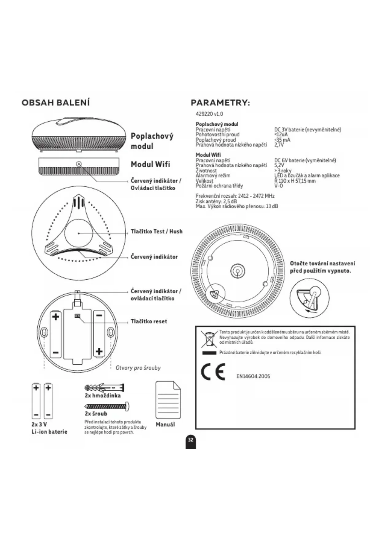 Informace o autorských právech: Autorská práva k této příručce jsou vlastnictvím výrobce. Všechna autorská práva jsou vyhrazena. S výjimkou případů povolených autorským zákonem nesmí nikdo bez předchozího souhlasu kopírovat, upravovat nebo překládat. Záruka: Obsah této příručky se může změnit bez předchozího upozornění. Nejnovější informace získáte od výrobce. Výrobce neodpovídá za škody způsobené chybami v této příručce a neodpovídá za škody způsobené poskytnutím nebo používáním této příručky. Společnost Calex nemůže být nikdy odpovědná za ztrátu a / nebo poškození jakékoli povahy, včetně náhodných a / nebo následných ztrát, které vyplývají ze skutečnosti, že signál z kouřového poplachu nezněl během kouře nebo ohně.38 Turn factory setting off before use. Red indicator / control button Reset button Screws holes Red indicator / Control button Test / Hush button Red indicator Wifi Module Alarm Module PACKING CONTENTS 2x Screw 2x Anchor plug Manual2x 3 Volt Li-ion Battery 429220 v1.0 Alarm Module Working Voltage DC 3V battery (non replaceble) Standby current <12uA Alarm current <35mA Low voltage threshold 2.7V Wifi Module Working Voltage DC 6V battery (replaceble) Low voltage threshold 5.2V Lifespan >3 years Alarm mode LED & buzzer & APP alarm Size Ø 110 x H 57.15 mm Fire protection grade V-0 Frequency range: 2412-2472MHz Antenna gain: 2.5dB Max. Radio Transmission Power: 13dB PARAMETERS: This product is intended for separate collection at a designated collection point. Do not dispose of the product with the household waste. For further information, please contact your local authorities. Dispose off empty batteries in a designated battery recycling bin. Before installing this product, check which plugs and screws are best suited for the surface. EN14604:200539 § 1 Nastavte Skôr ako začnete, zapíšte si svoje sieťové meno a heslo. Poznámka: Táto položka funguje iba v sieti Wi-Fi 2,4 GHz, nie v sieti WiFi 5 GHz. Nastavenia nájdete v príručke k vášmu smerovaču.
