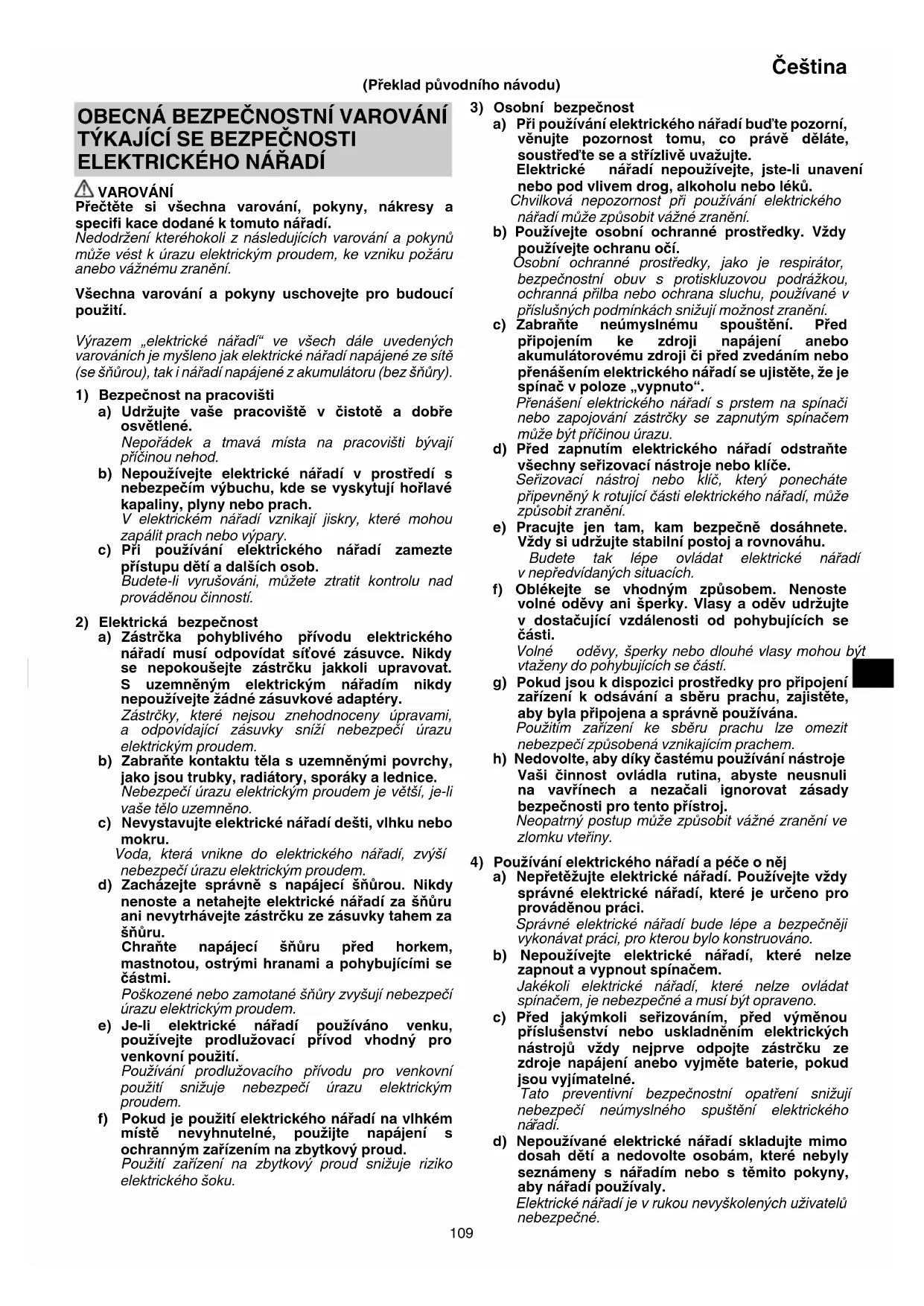 řadí. d) Nepoužívané elektrické nářadí skladujte mimo dosah dětí a nedovolte osobám, které nebyly seznámeny s nářadím nebo s těmito pokyny, aby nářadí používaly. Elektrické nářadí je v rukou nevyškolených uživatelů nebezpečné.