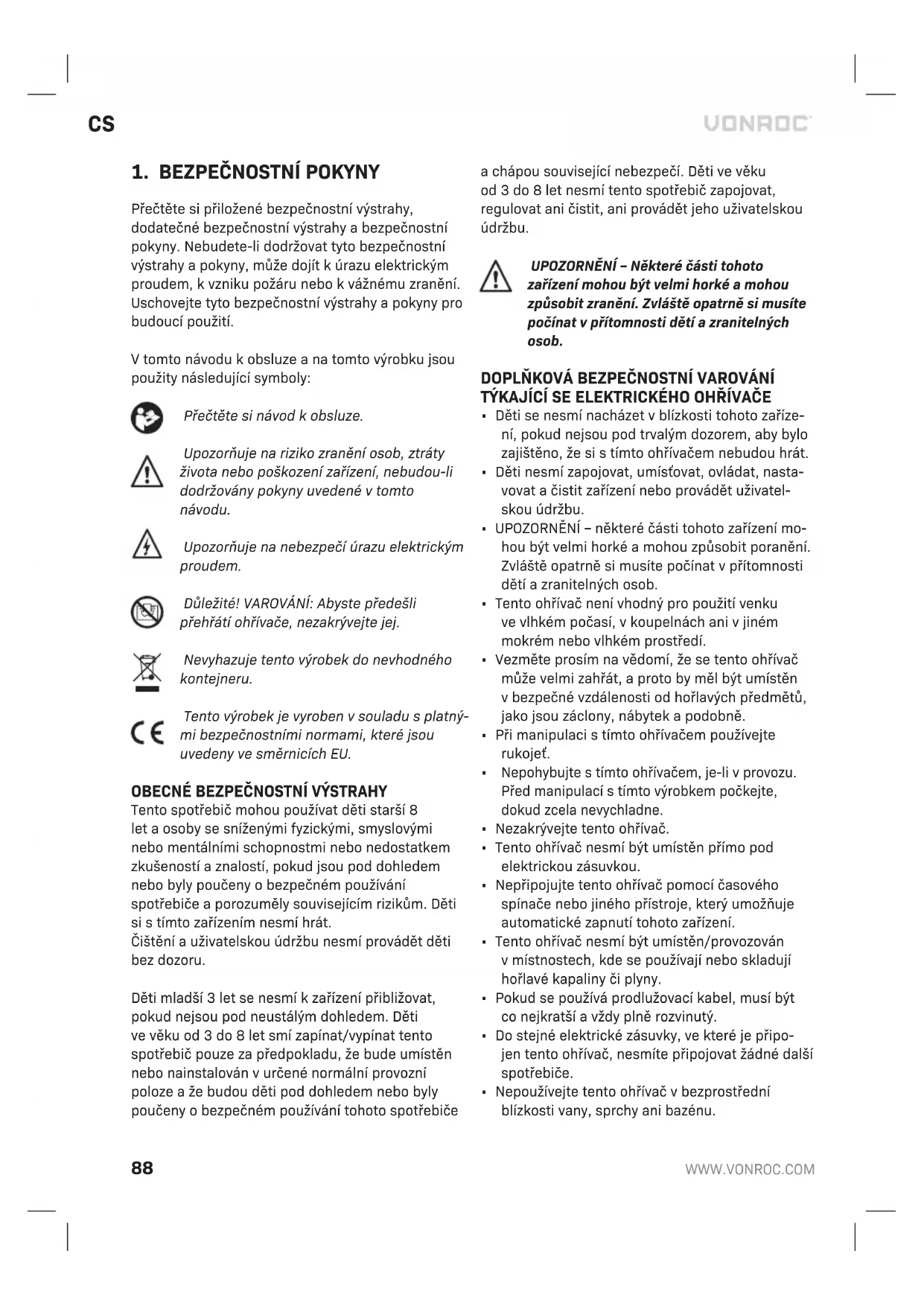 Přečtěte si přiložené bezpečnostní výstrahy, dodatečné bezpečnostní výstrahy abezpečnostní pokyny. Nebudete-li dodržovat tyto bezpečnostní výstrahy apokyny, může dojít kúrazu elektrickým proudem, kvzniku požáru nebo kvážnému zranění. Uschovejte tyto bezpečnostní výstrahy apokyny pro budoucí použití. Vtomto návodu kobsluze ana tomto výrobku jsou použity následující symboly: Přečtěte si návod kobsluze. Upozorňuje na riziko zranění osob, ztráty života nebo poškození zařízení, nebudou-li dodržovány pokyny uvedené vtomto návodu. Upozorňuje na nebezpečí úrazu elektrickým proudem. Důležité! VAROVÁNÍ: Abyste předešli přehřátí ohřívače, nezakrývejte jej. Nevyhazuje tento výrobek do nevhodného kontejneru. Tento výrobek je vyroben vsouladu splatný- mi bezpečnostními normami, které jsou uvedeny ve směrnicích EU.