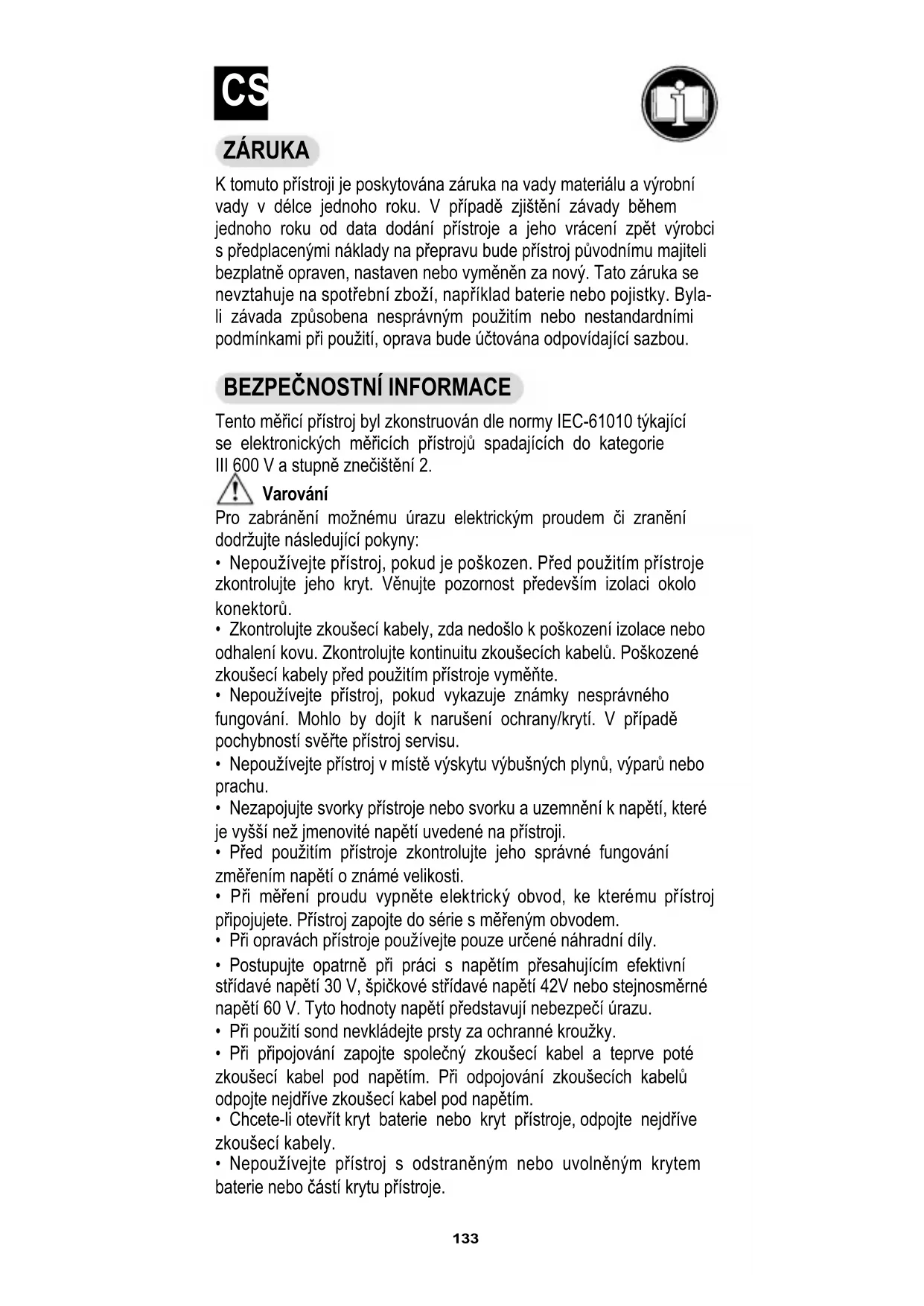Tento měřicí přístroj byl zkonstruován dle normy IEC-61010 týkající se elektronických měřicích přístrojů spadajících do kategorie III 600 V a stupně znečištění 2. Varování Pro zabránění možnému úrazu elektrickým proudem či zranění dodržujte následující pokyny: