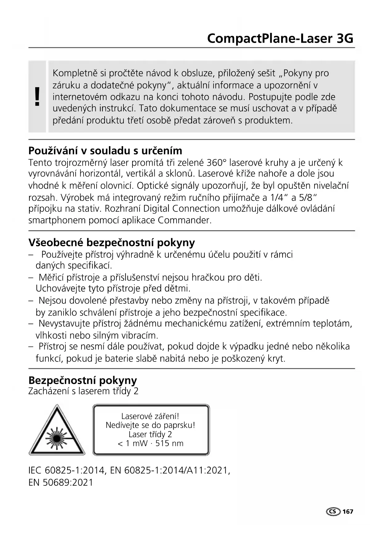 Používání v souladu s určením Tento trojrozměrný laser promítá tři zelené 360° laserové kruhy a je určený k vyrovnávání horizontál, vertikál a sklonů. Laserové kříže nahoře a dole jsou vhodné k měření olovnicí. Optické signály upozorňují, že byl opuštěn nivelační rozsah. Výrobek má integrovaný režim ručního přijímače a 1/4“ a 5/8“ přípojku na stativ. Rozhraní Digital Connection umožňuje dálkové ovládání smartphonem pomocí aplikace Commander. Všeobecné bezpečnostní pokyny – Používejte přístroj výhradně k určenému účelu použití v rámci daných specikací. – Měřicí přístroje a příslušenství nejsou hračkou pro děti. Uchovávejte tyto přístroje před dětmi. – Nejsou dovolené přestavby nebo změny na přístroji, v takovém případě by zaniklo schválení přístroje a jeho bezpečnostní specikace. – Nevystavujte přístroj žádnému mechanickému zatížení, extrémním teplotám, vlhkosti nebo silným vibracím. – Přístroj se nesmí dále používat, pokud dojde k výpadku jedné nebo několika funkcí, pokud je baterie slabě nabitá nebo je poškozený kryt. Bezpečnostní pokyny Zacházení s laserem třídy 2