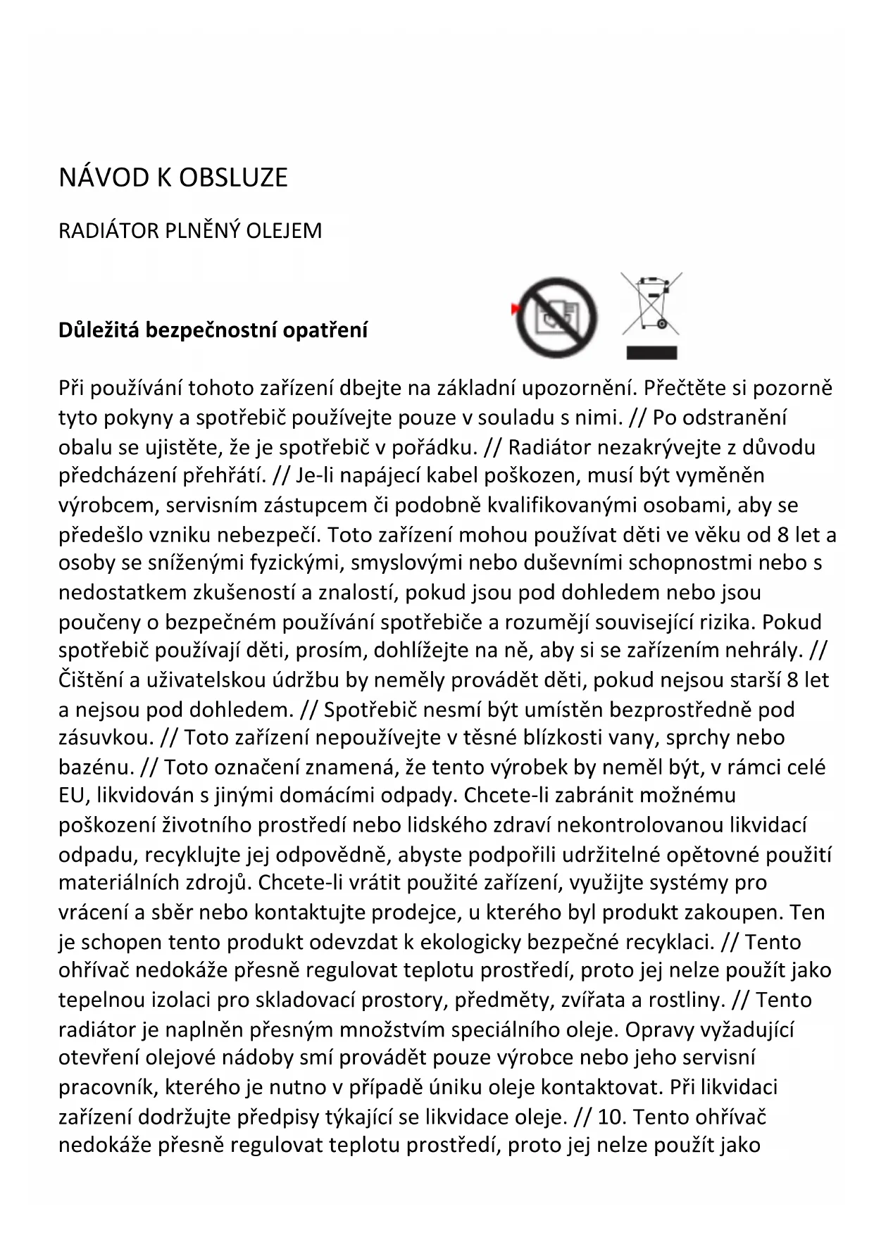 Důležitá bezpečnostní opatření Při používání tohoto zařízení dbejte na základní upozornění. Přečtěte si pozorně tyto pokyny a spotřebič používejte pouze v souladu s nimi. // Po odstranění obalu se ujistěte, že je spotřebič v pořádku. // Radiátor nezakrývejte z důvodu předcházení přehřátí. // Je-li napájecí kabel poškozen, musí být vyměněn výrobcem, servisním zástupcem či podobně kvalifikovanými osobami, aby se předešlo vzniku nebezpečí. Toto zařízení mohou používat děti ve věku od 8 let a osoby se sníženými fyzickými, smyslovými nebo duševními schopnostmi nebo s nedostatkem zkušeností a znalostí, pokud jsou pod dohledem nebo jsou poučeny o bezpečném používání spotřebiče a rozumějí související rizika. Pokud spotřebič používají děti, prosím, dohlížejte na ně, aby si se zařízením nehrály. // Čištění a uživatelskou údržbu by neměly provádět děti, pokud nejsou starší 8 let a nejsou pod dohledem. // Spotřebič nesmí být umístěn bezprostředně pod zásuvkou. // Toto zařízení nepoužívejte v těsné blízkosti vany, sprchy nebo bazénu. // Toto označení znamená, že tento výrobek by neměl být, v rámci celé EU, likvidován s jinými domácími odpady. Chcete-li zabránit možnému poškození životního prostředí nebo lidského zdraví nekontrolovanou likvidací odpadu, recyklujte jej odpovědně, abyste podpořili udržitelné opětovné použití materiálních zdrojů. Chcete-li vrátit použité zařízení, využijte systémy pro vrácení a sběr nebo kontaktujte prodejce, u kterého byl produkt zakoupen. Ten je schopen tento produkt odevzdat k ekologicky bezpečné recyklaci. // Tento ohřívač nedokáže přesně regulovat teplotu prostředí, proto jej nelze použít jako tepelnou izolaci pro skladovací prostory, předměty, zvířata a rostliny. // Tento radiátor je naplněn přesným množstvím speciálního oleje. Opravy vyžadující otevření olejové nádoby smí provádět pouze výrobce nebo jeho servisní pracovník, kterého je nutno v případě úniku oleje kontaktovat. Při likvidaci zařízení dodržujte předpisy týkající se likvidace oleje. // 10. Tento ohřívač nedokáže přesně regulovat teplotu prostředí, proto jej nelze použít jakotepelnou izolaci pro skladovací prostory, předměty, zvířata a rostliny. // Zařízení je určeno pro použití v domácnosti. Pozor Pokud je topné těleso zakryto zástěnou nebo jiným hořlavým materiálem nebo se nachází v jeho blízkosti, hrozí riziko požáru. // Některé části tohoto produktu se mohou velmi zahřát a způsobit popáleniny. Zvláštní pozornost je třeba věnovat přítomnosti dětí a zranitelných osob.HLAVNÉ ČÁSTI (OR2000M) Žebra Knoflík spínače napájení Knoflík termostatu Vinutí kabelu Kolečka POUŽITÍ OLEJEM PLNĚNÉHO RADIÁTORU (OR2000M)