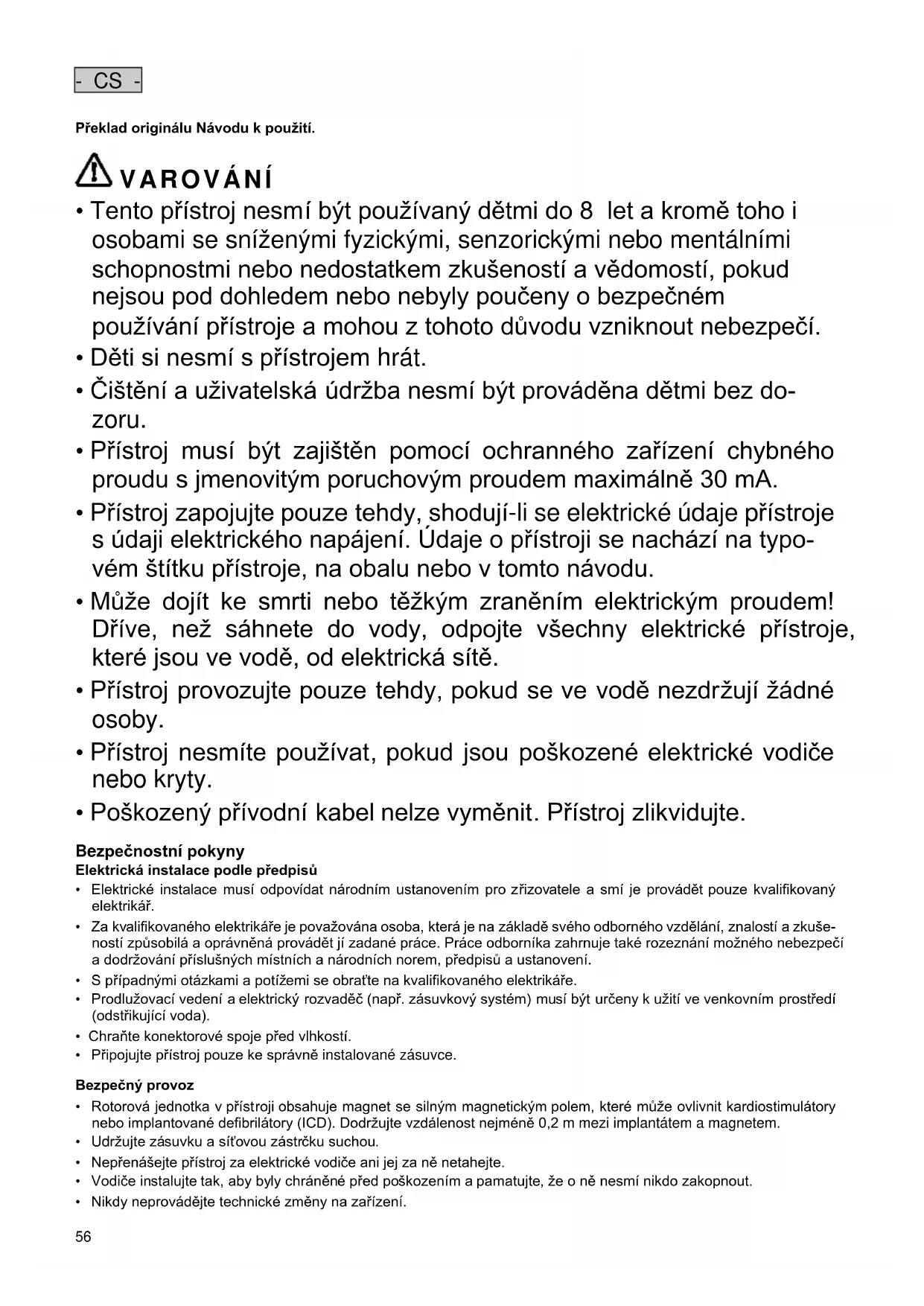 - Může dojít ke smrti nebo těžkým zraněním elektrickým proudem! Dříve, než sáhnete do vody, odpojte všechny elektrické přístroje, které jsou ve vodě, od elektrická sítě.