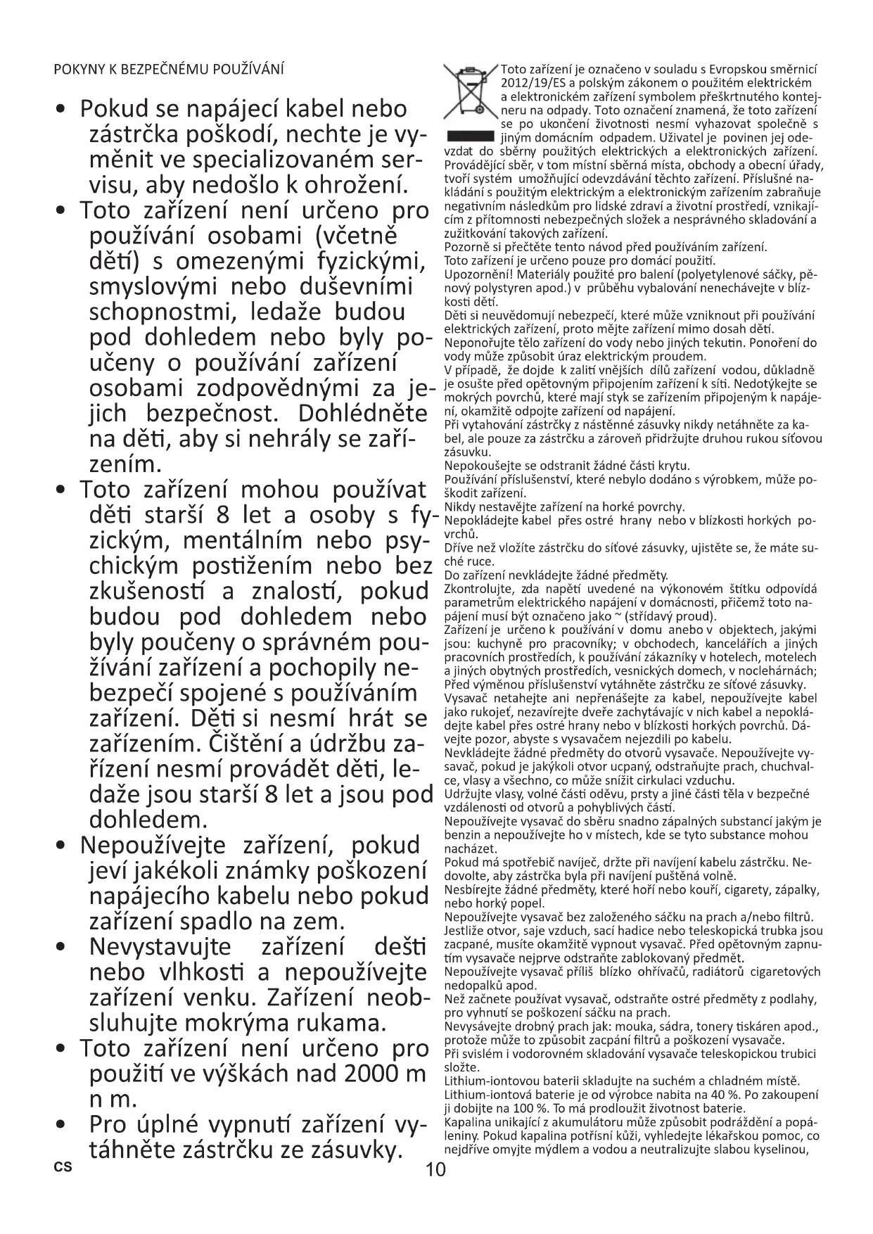 - Pro úplné vypnu zařízení vy- táhněte zástrčku ze zásuvky. Toto zařízení je označeno v souladu s Evropskou směrnicí 2012/19/ES a polským zákonem o použitém elektrickém a elektronickém zařízení symbolem přeškrtnutého kontej- neru na odpady. Toto označení znamená, že toto zařízení se po ukončení životnos nesmí vyhazovat společně s jiným domácním odpadem. Uživatel je povinen jej ode- vzdat do sběrny použitých elektrických a elektronických zařízení. Provádějící sběr, v tom místní sběrná místa, obchody a obecní úřady, tvoří systém umožňující odevzdávání těchto zařízení. Příslušné na- kládání s použitým elektrickým a elektronickým zařízením zabraňuje negavním následkům pro lidské zdraví a životní prostředí, vznikají- cím z přítomnos nebezpečných složek a nesprávného skladování a zužitkování takových zařízení. Pozorně si přečtěte tento návod před používáním zařízení. Toto zařízení je určeno pouze pro domácí použi. Upozornění! Materiály použité pro balení (polyetylenové sáčky, pě- nový polystyren apod.) v průběhu vybalování nenechávejte v blíz- kos dě. Dě si neuvědomují nebezpečí, které může vzniknout při používání elektrických zařízení, proto mějte zařízení mimo dosah dě. Neponořujte tělo zařízení do vody nebo jiných tekun. Ponoření do vody může způsobit úraz elektrickým proudem. V případě, že dojde k zali vnějších dílů zařízení vodou, důkladně je osušte před opětovným připojením zařízení k sí. Nedotýkejte se mokrých povrchů, které mají styk se zařízením připojeným k napáje- ní, okamžitě odpojte zařízení od napájení. Při vytahování zástrčky z nástěnné zásuvky nikdy netáhněte za ka- bel, ale pouze za zástrčku a zároveň přidržujte druhou rukou síťovou zásuvku. Nepokoušejte se odstranit žádné čás krytu. Používání příslušenství, které nebylo dodáno s výrobkem, může po- škodit zařízení. Nikdy nestavějte zařízení na horké povrchy. Nepokládejte kabel přes ostré hrany nebo v blízkos horkých po- vrchů. Dříve než vložíte zástrčku do síťové zásuvky, ujistěte se, že máte su- ché ruce. Do zařízení nevkládejte žádné předměty. Zkontrolujte, zda napě uvedené na výkonovém štku odpovídá parametrům elektrického napájení v domácnos, přičemž toto na- pájení musí být označeno jako ~ (střídavý proud). Zařízení je určeno k používání v domu anebo v objektech, jakými jsou: kuchyně pro pracovníky; v obchodech, kancelářích a jiných pracovních prostředích, k používání zákazníky v hotelech, motelech a jiných obytných prostředích, vesnických domech, v noclehárnách; Před výměnou příslušenství vytáhněte zástrčku ze síťové zásuvky. Vysavač netahejte ani nepřenášejte za kabel, nepoužívejte kabel jako rukojeť, nezavírejte dveře zachytávajíc v nich kabel a nepoklá- dejte kabel přes ostré hrany nebo v blízkos horkých povrchů. Dá- vejte pozor, abyste s vysavačem nejezdili po kabelu. Nevkládejte žádné předměty do otvorů vysavače. Nepoužívejte vy- savač, pokud je jakýkoli otvor ucpaný, odstraňujte prach, chuchval- ce, vlasy a všechno, co může snížit cirkulaci vzduchu. Udržujte vlasy, volné čás oděvu, prsty a jiné čás těla v bezpečné vzdálenos od otvorů a pohyblivých čás. Nepoužívejte vysavač do sběru snadno zápalných substancí jakým je benzin a nepoužívejte ho v místech, kde se tyto substance mohou nacházet. Pokud má spotřebič navíječ, držte při navíjení kabelu zástrčku. Ne- dovolte, aby zástrčka byla při navíjení puštěná volně. Nesbírejte žádné předměty, které hoří nebo kouří, cigarety, zápalky, nebo horký popel. Nepoužívejte vysavač bez založeného sáčku na prach a/nebo ltrů. Jestliže otvor, saje vzduch, sací hadice nebo teleskopická trubka jsou zacpané, musíte okamžitě vypnout vysavač. Před opětovným zapnu- m vysavače nejprve odstraňte zablokovaný předmět. Nepoužívejte vysavač příliš blízko ohřívačů, radiátorů cigaretových nedopalků apod. Než začnete používat vysavač, odstraňte ostré předměty z podlahy, pro vyhnu se poškození sáčku na prach. Nevysávejte drobný prach jak: mouka, sádra, tonery skáren apod., protože může to způsobit zacpání ltrů a poškození vysavače. Při svislém i vodorovném skladování vysavače teleskopickou trubici složte. Lithiumiontovou baterii skladujte na suchém a chladném místě. Lithiumiontová baterie je od výrobce nabita na 40 %. Po zakoupení ji dobijte na 100 %. To má prodloužit životnost baterie. Kapalina unikající z akumulátoru může způsobit podráždění a popá- leniny. Pokud kapalina potřísní kůži, vyhledejte lékařskou pomoc, co nejdříve omyjte mýdlem a vodou a neutralizujte slabou kyselinou,11
