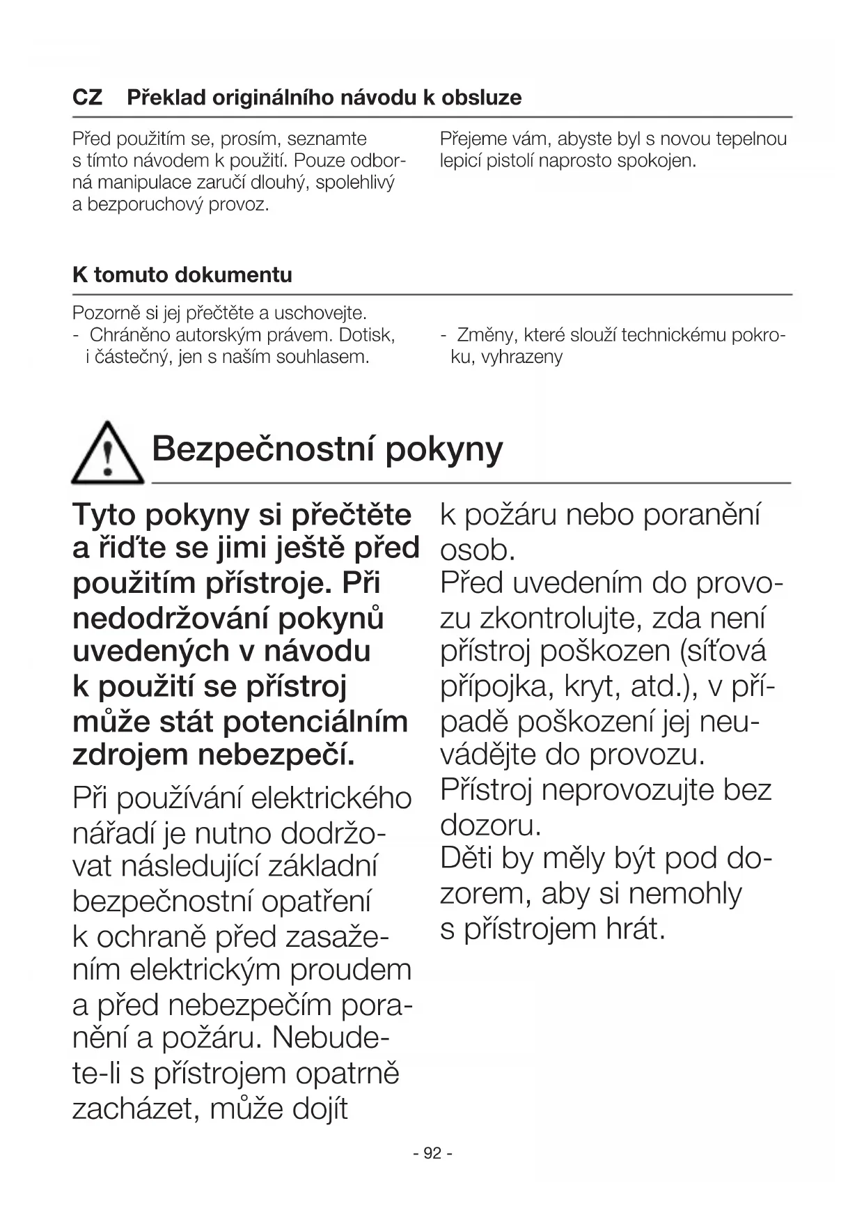 Berte vúvahu vlivy okolního prostředí. Elektrické nářadí nepone- chávejte na dešti. Nepou- žívejte elektrické nářadí ve vlhkém stavu ave vlhkém nebo mokrém prostředí. Obzvláště opatrně si po- čínejte při používání pří- stroje vblízkosti hořlavých materiálů. Přístroj nemá být namířen delší dobu na jedno atotéž místo. Přístroj nesmí být použí- ván vatmosféře, ve které hrozí nebezpečí výbuchu. Unikající teplo může být přivedeno khořlavým materiálům, které jsou zakryty. Chraňte se před zasažením elektric- kým proudem. Při práci zamezte kon- taktu těla suzemněnými součástmi, například spotrubím, topnými těle- sy, sporáky či chladnič- kami. Přístroj nenechávejte běžet bez dozoru. Ukládejte nářadí na bezpečném místě. Po použití přístroj položte na stojánek apřed ulo- žením zpět do obalu jej nechejte vychladnout. Nepoužívané nářadí musí být uschováno vsuché, uzavřené místnosti ami- mo dosah dětí. Tento přístroj může být používán dětmi od 8let aosobami se sníženými fyzickými, senzorickými nebo mentálními schop- nostmi nebo snedostat- kem zkušeností avědo- mostí jen tehdy, když jsou pod dozorem nebo byly poučeny obezpečném používání přístroje apo- chopily ztoho vyplývající nebezpečí. Bezpečnostní pokyny- 94 - Děti si nesmí spřístrojem hrát. Čištění aúdržbu nesmí děti provádět bez dozoru. Nářadí nikdy nepřetěžujte. Vuvedeném výkonovém rozsahu budete pracovat účinněji abezpečněji. Nepřenášejte nářadí za kabel anepoužívejte jej kvytažení zástrčky kabe- lu zelektrické zásuvky. Chraňte kabel před hor- kem, olejem aostrými hranami. Dávejte pozor na jedo- vaté plyny ane- bezpečí vznícení. Při zpracování plastů, laků aobdobných materiálů může docházet ke vzniku jedovatých plynů. Věnujte pozornost ne- bezpečí vznícení avzniku požáru. Vzájmu vlastní bezpeč- nosti používejte pouze příslušenství apřídavná zařízení, která jsou uve- dena vnávodu kpoužití nebo jsou doporučena výrobcem nářadí či uve- dena vjeho katalogu. Použití jiných pracovních nástrojů nebo součástí příslušenství, než které jsou doporučeny vná- vodu kpoužití nebo vkatalogu, může mít za následek nebezpečí úrazu obsluhy. Opravy svěřujte pouze kvalifikovanému elektromontérovi. Toto elektrické nářadí odpovídá příslušným bez- pečnostním ustanovením. Jeho opravy smí provádět pouze kvalifikovaní elek- tromontéři, vopačném případě může dojít kúra- zu obsluhy. Je-li připojo- Bezpečnostní pokyny- 95 -