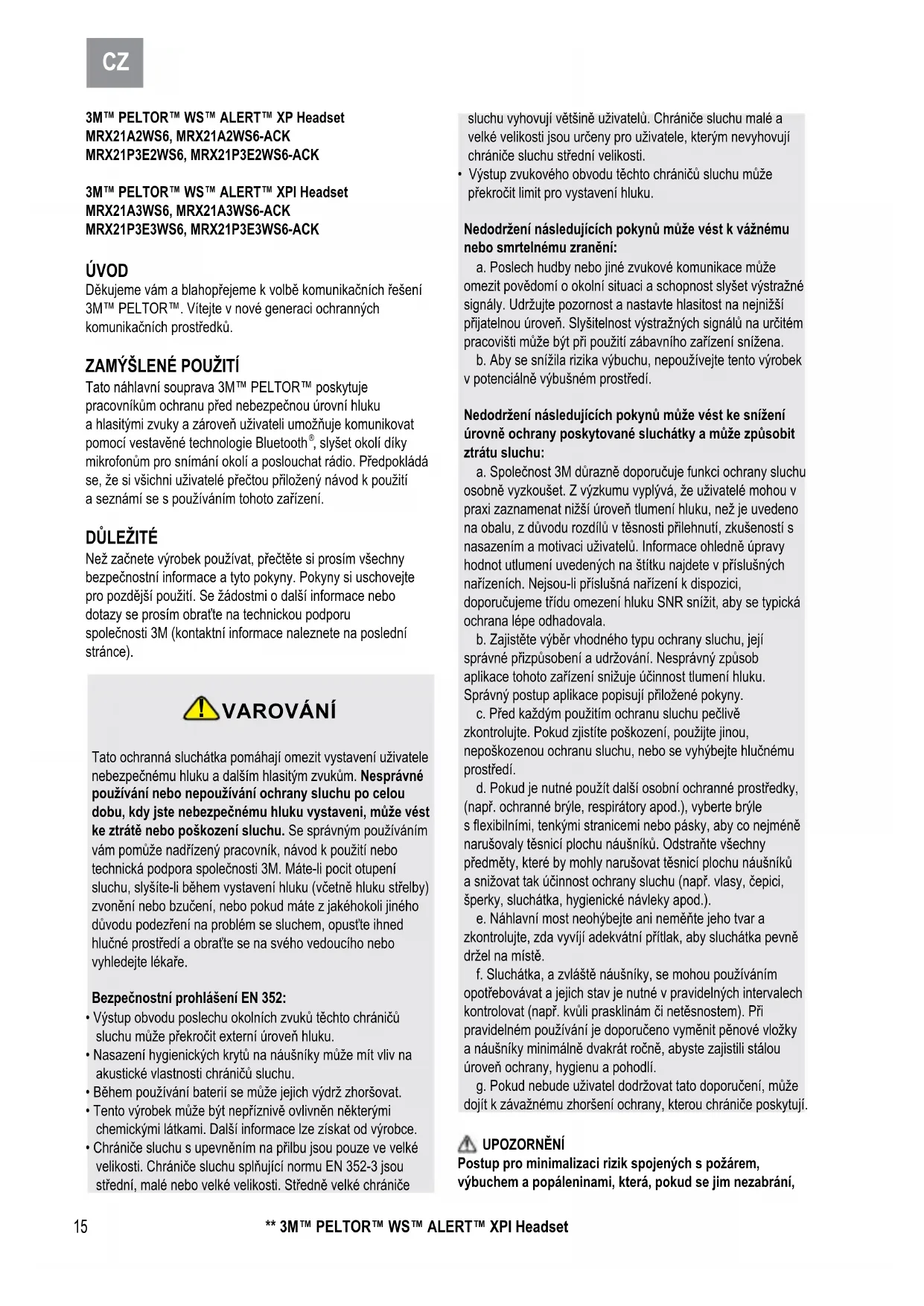 VAROVÁNÍ Tato ochranná sluchátka pomáhají omezit vystavení uživatele nebezpečnému hluku a dalším hlasitým zvukům. Nesprávné používání nebo nepoužívání ochrany sluchu po celou dobu, kdy jste nebezpečnému hluku vystaveni, může vést ke ztrátě nebo poškození sluchu. Se správným používáním vám pomůže nadřízený pracovník, návod k použití nebo technická podpora společnosti 3M. Máte-li pocit otupení sluchu, slyšíte-li během vystavení hluku (včetně hluku střelby) zvonění nebo bzučení, nebo pokud máte z jakéhokoli jiného důvodu podezření na problém se sluchem, opusťte ihned hlučné prostředí a obraťte se na svého vedoucího nebo vyhledejte lékaře.Bezpečnostní prohlášení EN 352:• Výstup obvodu poslechu okolních zvuků těchto chráničů sluchu může překročit externí úroveň hluku.• Nasazení hygienických krytů na náušníky může mít vliv na akustické vlastnosti chráničů sluchu.• Během používání baterií se může jejich výdrž zhoršovat. • Tento výrobek může být nepříznivě ovlivněn některými chemickými látkami. Další informace lze získat od výrobce.• Chrániče sluchu s upevněním na přilbu jsou pouze ve velké velikosti. Chrániče sluchu splňující normu EN 352-3 jsou střední, malé nebo velké velikosti. Středně velké chrániče sluchu vyhovují většině uživatelů. Chrániče sluchu malé a velké velikosti jsou určeny pro uživatele, kterým nevyhovují chrániče sluchu střední velikosti.• Výstup zvukového obvodu těchto chráničů sluchu může překročit limit pro vystavení hluku.Nedodržení následujících pokynů může vést k vážnému nebo smrtelnému zranění:a. Poslech hudby nebo jiné zvukové komunikace může omezit povědomí o okolní situaci a schopnost slyšet výstražné signály. Udržujte pozornost a nastavte hlasitost na nejnižší přijatelnou úroveň. Slyšitelnost výstražných signálů na určitém pracovišti může být při použití zábavního zařízení snížena.b. Aby se snížila rizika výbuchu, nepoužívejte tento výrobek v potenciálně výbušném prostředí.Nedodržení následujících pokynů může vést ke snížení úrovně ochrany poskytované sluchátky a může způsobit ztrátu sluchu:a. Společnost 3M důrazně doporučuje funkci ochrany sluchu osobně vyzkoušet. Z výzkumu vyplývá, že uživatelé mohou v praxi zaznamenat nižší úroveň tlumení hluku, než je uvedeno na obalu, z důvodu rozdílů v těsnosti přilehnutí, zkušeností s nasazením a motivaci uživatelů. Informace ohledně úpravy hodnot utlumení uvedených na štítku najdete v příslušných nařízeních. Nejsou-li příslušná nařízení k dispozici, doporučujeme třídu omezení hluku SNR snížit, aby se typická ochrana lépe odhadovala. b. Zajistěte výběr vhodného typu ochrany sluchu, její správné přizpůsobení a udržování. Nesprávný způsob aplikace tohoto zařízení snižuje účinnost tlumení hluku. Správný postup aplikace popisují přiložené pokyny.c. Před každým použitím ochranu sluchu pečlivě zkontrolujte. Pokud zjistíte poškození, použijte jinou, nepoškozenou ochranu sluchu, nebo se vyhýbejte hlučnému prostředí.d. Pokud je nutné použít další osobní ochranné prostředky, (např. ochranné brýle, respirátory apod.), vyberte brýle s exibilními, tenkými stranicemi nebo pásky, aby co nejméně narušovaly těsnicí plochu náušníků. Odstraňte všechny předměty, které by mohly narušovat těsnicí plochu náušníků a snižovat tak účinnost ochrany sluchu (např. vlasy, čepici, šperky, sluchátka, hygienické návleky apod.).e. Náhlavní most neohýbejte ani neměňte jeho tvar a zkontrolujte, zda vyvíjí adekvátní přítlak, aby sluchátka pevně držel na místě.f. Sluchátka, a zvláště náušníky, se mohou používáním opotřebovávat a jejich stav je nutné v pravidelných intervalech kontrolovat (např. kvůli prasklinám či netěsnostem). Při pravidelném používání je doporučeno vyměnit pěnové vložky a náušníky minimálně dvakrát ročně, abyste zajistili stálou úroveň ochrany, hygienu a pohodlí.g. Pokud nebude uživatel dodržovat tato doporučení, může dojít k závažnému zhoršení ochrany, kterou chrániče poskytují.UPOZORNĚNÍPostup pro minimalizaci rizik spojených s požárem, výbuchem a popáleninami, která, pokud se jim nezabrání,