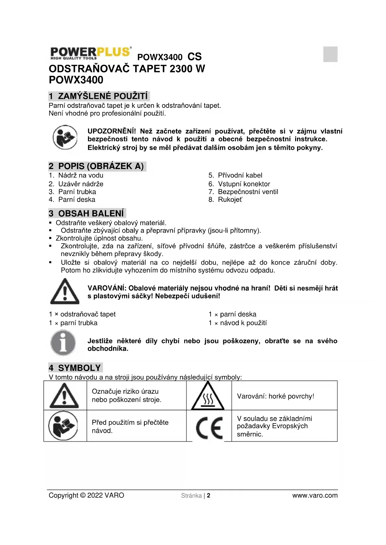 - Jakmile přestanete parní odstraňovač tapet používat, odpojte jej od sítě a nechte zařízení několik minut vychládat. Před uložením se ujistěte, že byla vypuštěna veškerá voda z nádrže na vodu.POWX3400 CS Copyright © 2022 VARO Stránka | 6 www.varo.com VAROVÁNÍ! Pravidelně kontrolujte hladinu vody (například každých 45 minut). Před doplněním vody odpojte zařízení od sítě a před sejmutím víčka dvě minuty počkejte!