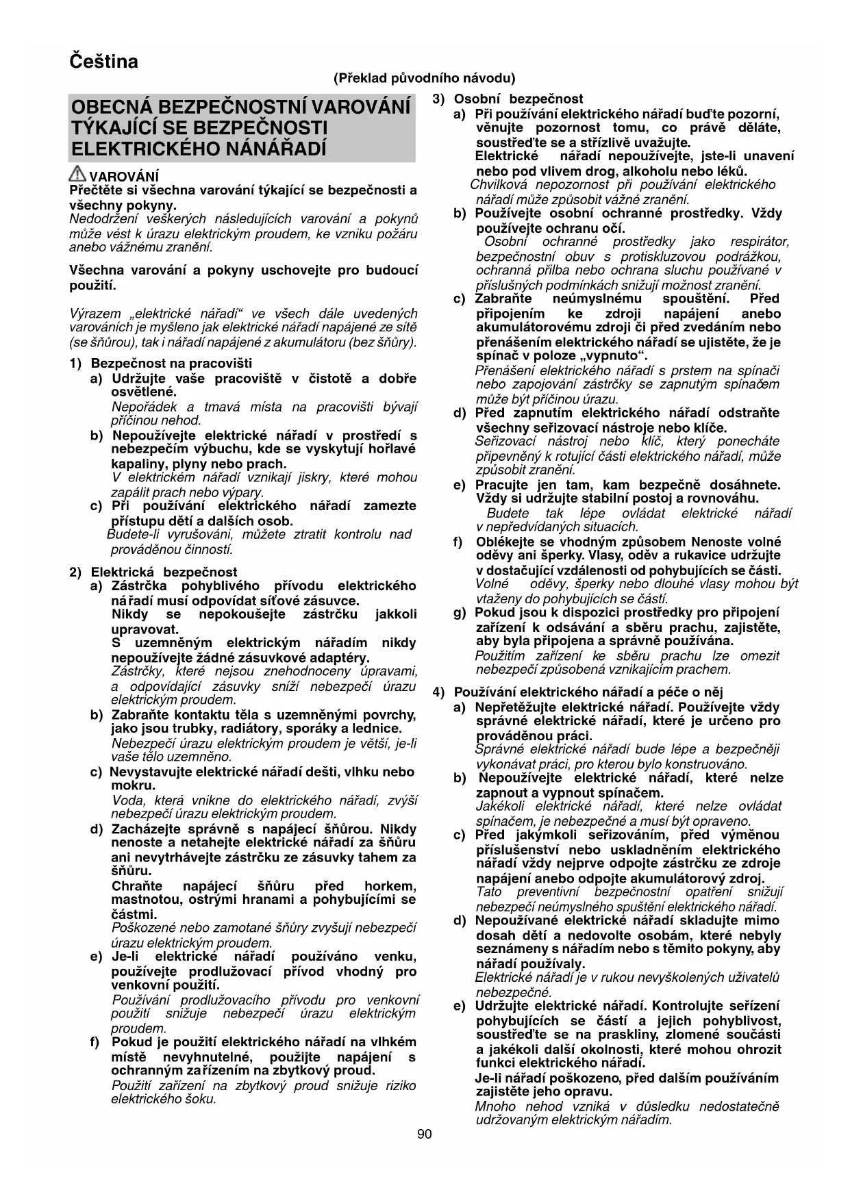 VAROVÁNÍ Přečtěte si všechna varování týkající se bezpečnosti a všechny pokyny. Nedodržení veškerých následujících varování a pokynů může vést k úrazu elektrickým proudem, ke vzniku požáru anebo vážnému zranění. Všechna varování a pokyny uschovejte pro budoucí použití. Výrazem „elektrické nářadí“ ve všech dále uvedených varováních je myšleno jak elektrické nářadí napájené ze sítě (se šňůrou), tak i nářadí napájené z akumulátoru (bez šňůry).