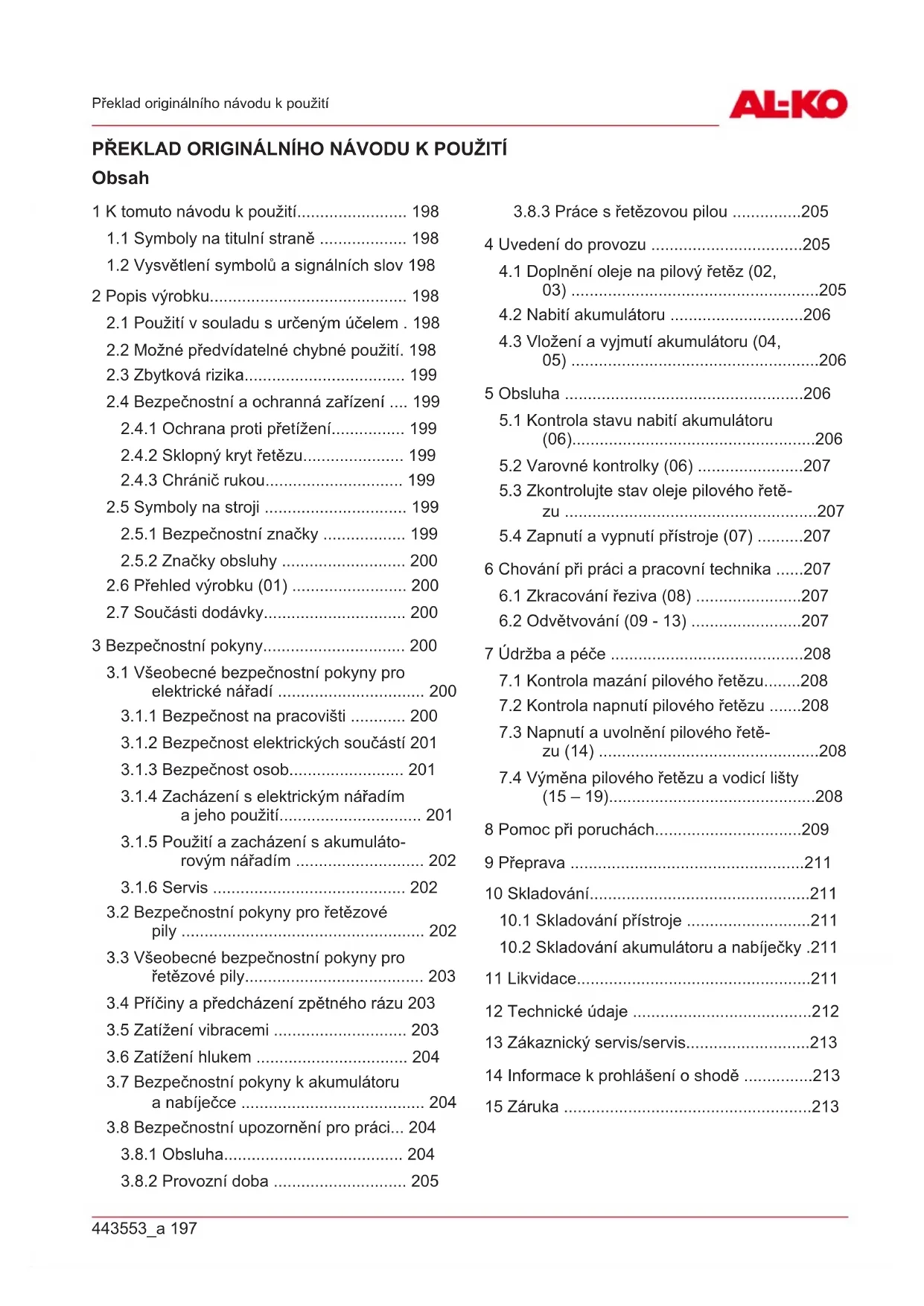 Opotřebované díly, které jsou na kartě náhradních dílů xxxxxx (x) označeny rámečkem. Záruční doba začíná dnem nákupu prvním koncovým uživatelem. Rozhodující je datum na nákupním dokladu. Stímto záručním listem a originálem nákupního dokladu se obraťte na svého prodejce nebo nejbližší autorizovaný servis pro zákazníky. Zákonné nároky kupujícího na reklamaci nedostatků vůči prodávajícímu zůstávají tímto prohlášením nedotčeny.443553_a 215 Preklad originálneho návodu na použitie PREKLAD ORIGINÁLNEHO NÁVODU NA POUŽITIE Obsah 1 O tomto návode na obsluhu..................... 216