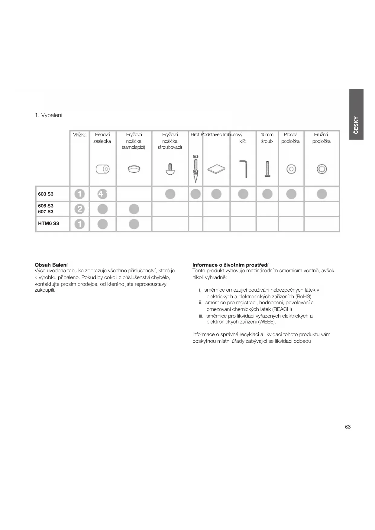Mřížka Pěnová záslepkaPryžová nožička (samolepící)Pryžová nožička (šroubovací)Hrot Podstavec Imbusový klíč 45mm šroubPlochá podložkaPružná podložka603 S3 606 S3607 S3 HTM6 S3