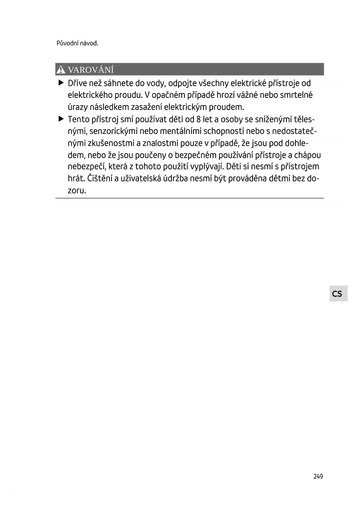 VAROV ÁNÍ VAROVÁNÍ Dříve než sáhnete do vody, odpojte všechny elektrické přístroje od elektrického proudu. V opačném případě hrozí vážné nebo smrtelné úrazy následkem zasažení elektrickým proudem. Tento přístroj smí používat děti od 8 let a osoby se sníženými těles- nými, senzorickými nebo mentálními schopnosti nebo s nedostateč- nými zkušenostmi a znalostmi pouze v případě, že jsou pod dohle- dem, nebo že jsou poučeny o bezpečném používání přístroje a chápou nebezpečí, která z tohoto použití vyplývají. Děti si nesmí s přístrojem hrát. Čištění a uživatelská údržba nesmí být prováděna dětmi bez do- zoru.250 Bezpečnostní pokyny Přípojka elektrické energie