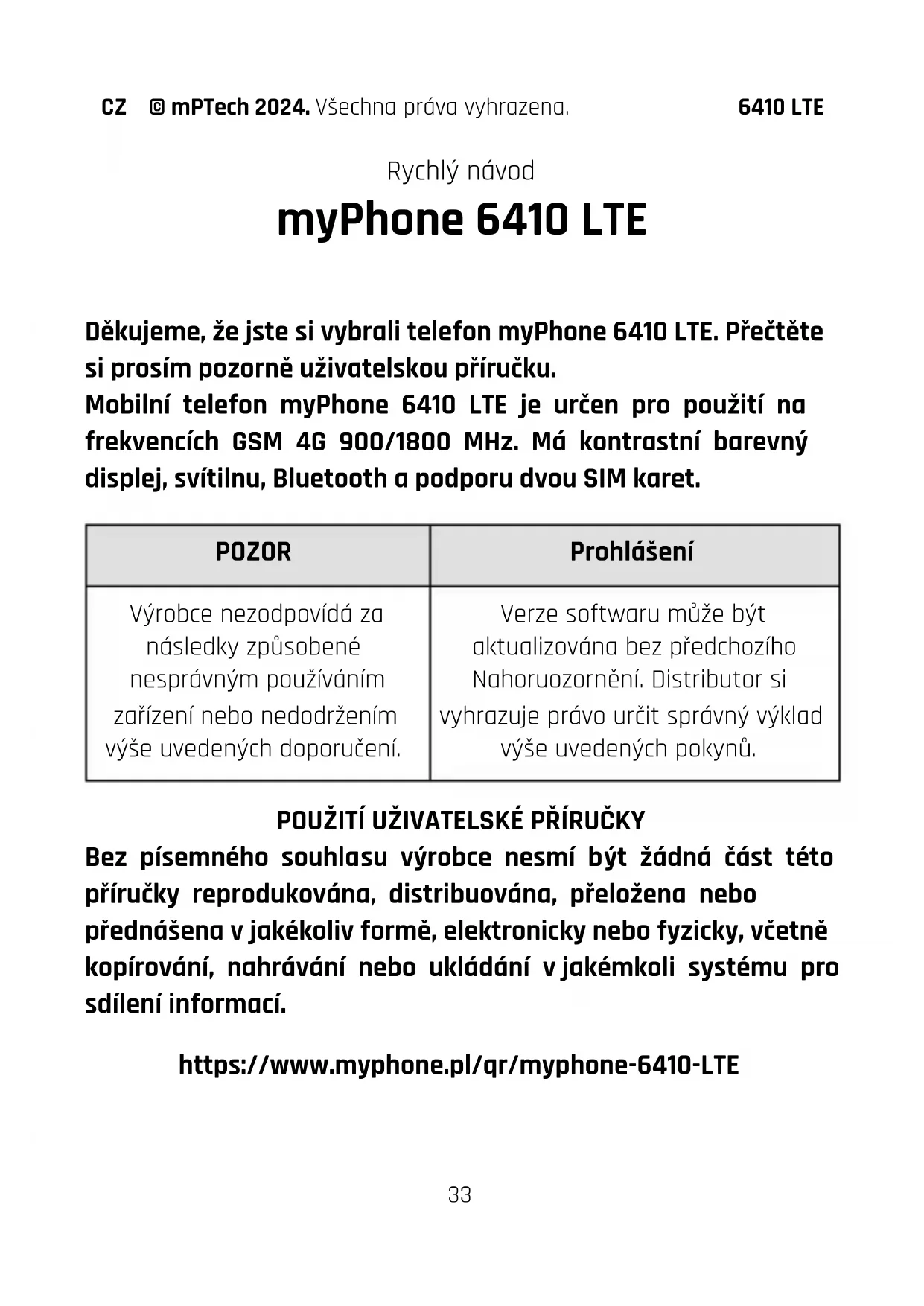 POUŽITÍ UŽIVATELSKÉ PŘÍRUČKY Bez písemného souhlasu výrobce nesmí být žádná část této příručky reprodukována, distribuována, přeložena nebo přednášena v jakékoliv formě, elektronicky nebo fyzicky, včetně kopírování, nahrávání nebo ukládání v jakémkoli systému pro sdílení informací. https://www.myphone.pl/qr/myphone-6410-LTECZ © mPTech 2024. Všechna práva vyhrazena. 6410 LTE