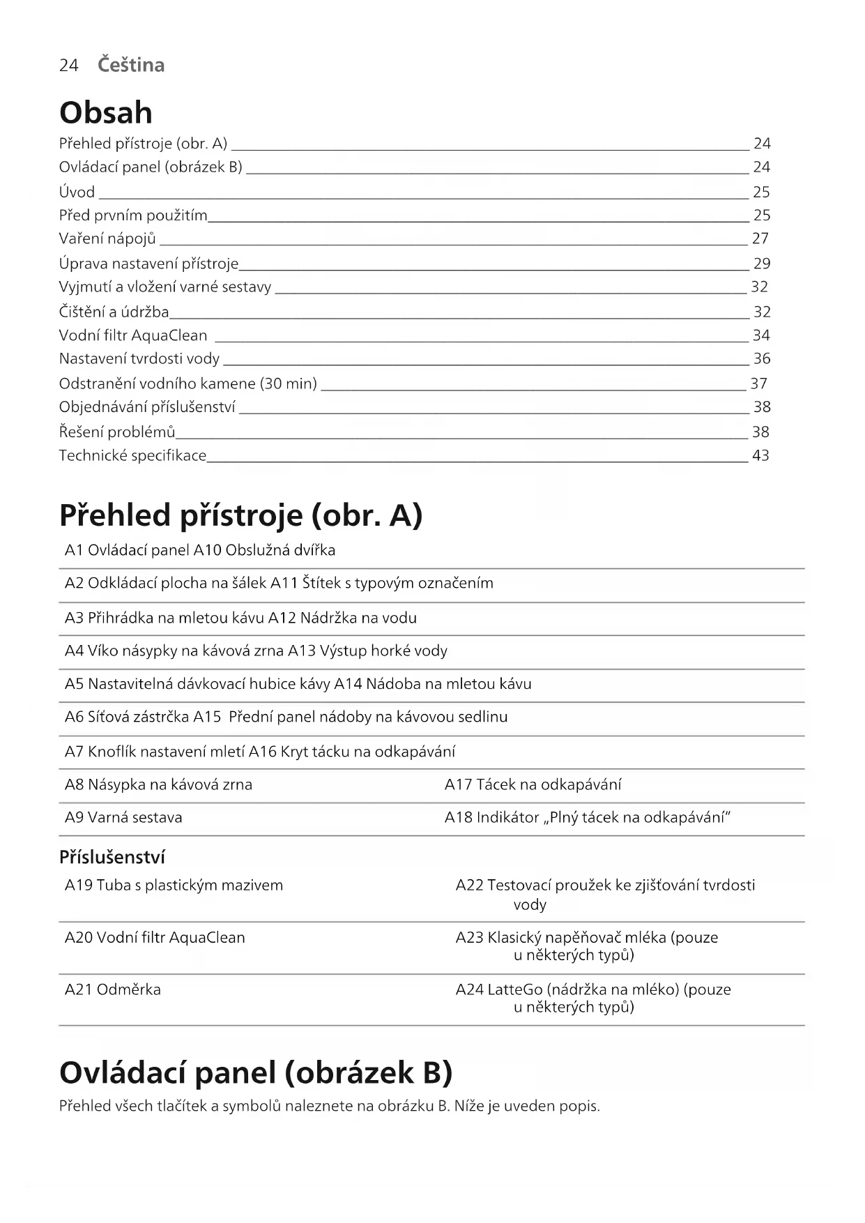 Čeština Obsah Přehled přístroje (obr.A) ___________________________________________________________________ 24 Ovládací panel (obrázekB) _________________________________________________________________ 24 Úvod ____________________________________________________________________________________ 25 Před prvním použitím______________________________________________________________________ 25 Vaření nápojů ____________________________________________________________________________ 27 Úprava nastavení přístroje__________________________________________________________________ 29 Vyjmutí avložení varné sestavy _____________________________________________________________ 32 Čištění aúdržba___________________________________________________________________________ 32 Vodní filtr AquaClean _____________________________________________________________________ 34 Nastavení tvrdosti vody ____________________________________________________________________ 36 Odstranění vodního kamene (30min) _______________________________________________________ 37 Objednávání příslušenství __________________________________________________________________ 38 Řešení problémů__________________________________________________________________________ 38 Technické specifikace______________________________________________________________________ 43 Přehled přístroje (obr.A) A1 Ovládací panel A10 Obslužná dvířka A2 Odkládací plocha na šálek A11 Štítek stypovým označením A3 Přihrádka na mletou kávu A12 Nádržka na vodu A4 Víko násypky na kávová zrna A13 Výstup horké vody A5 Nastavitelná dávkovací hubice kávy A14 Nádoba na mletou kávu A6 Síťová zástrčka A15 Přední panel nádoby na kávovou sedlinu A7 Knoflík nastavení mletí A16 Kryt tácku na odkapávání A8 Násypka na kávová zrna A17 Tácek na odkapávání A9 Varná sestava A18 Indikátor „Plný tácek na odkapávání“ Příslušenství A19 Tuba splastickým mazivem A22 Testovací proužek ke zjišťování tvrdosti vody A20 Vodní filtr AquaClean A23 Klasický napěňovač mléka (pouze uněkterých typů) A21 Odměrka A24 LatteGo (nádržka na mléko) (pouze uněkterých typů) Ovládací panel (obrázekB) Přehled všech tlačítek asymbolů naleznete na obrázkuB. Níže je uveden popis.25 Čeština Čeština Některá tlačítka/symboly se nacházejí pouze na určitých typech zařízení. B1 vypínač B7 Varovné symboly B2 Symboly nápojů* B8 Kontrolka spuštění B3 Symbol intenzity aromatu / mleté kávy B9 Tlačítko spuštění/zastavení B4 Symbol množství nápoje B10 Symbol funkce Calc/Clean B5 Symbol množství mléka (pouze uněkterých typů) B11 Symbol AquaClean B6 Symbol teploty kávy (pouze uněkterých typů) *Symboly nápojů (pouze některé typy): espresso, espresso lungo, káva, ledová káva, cappuccino, latte macchiato, horká voda, pára Úvod Gratulujeme Vám kzakoupení plně automatického kávovaru Philips! Chcete-li plně využívat výhod, které nabízíme, zaregistrujte výrobek na adrese www.philips.com/welcome. Před prvním použitím kávovaru si pečlivě přečtěte samostatnou brožuru sbezpečnostními informacemi a uschovejte ji pro budoucí použití. Nabízíme několik způsobů, které vám pomohou suvedením přístroje do provozu aspoužíváním všech jeho funkcí. Vbalení se nachází: 1 Tento stručný návod kpoužití sobrázkovými pokyny kpoužívání ainformacemi očištění aúdržbě. 2 Samostatná bezpečnostní brožura spokyny kbezpečnému používání přístroje. 3 Vpřípadě zájmu oonline podporu (rozšířenou verzi této uživatelské příručky, časté dotazy, videa atd.) nasnímejte kód QR na obálce této brožury a stáhněte aplikaci Coffee+ nebo navštivte stránky www.philips.com/coffee-care. Tento espresovač existuje ve více verzích a každá má jiné funkce. Jednotlivé verze mají vlastní typové označení. Typové označení se nachází na štítku na vnitřní straně obslužných dvířek (viz obr. A11). Tento přístroj podstoupil zkoušku spoužitím kávy. Ikdyž byl pečlivě vyčištěn, mohly vněm zůstat zbytky kávy. Zaručujeme však, že přístroj je zcela nový. Přístroj automaticky upravuje množství mleté kávy, které je potřeba kpřípravě té nejchutnější kávy. Nejprve je třeba připravit 5káv, na nichž přístroj provede svou kalibraci. Před prvním použitím nezapomeňte propláchnout jednotku LatteGo (nádržka na mléko) nebo klasický napěňovač mléka. Před prvním použitím