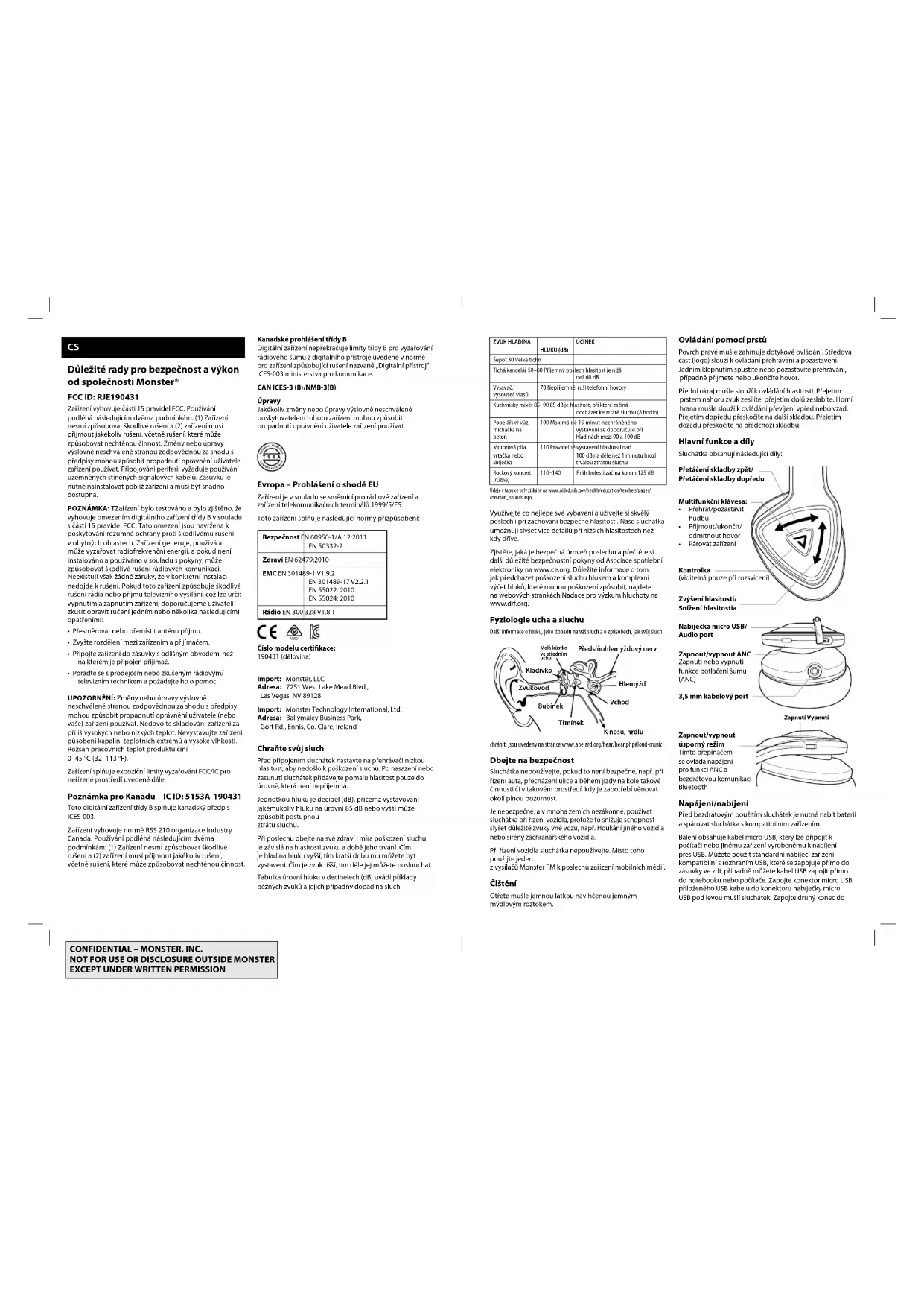 EN 301489-17 V2.2.1 EN 55022: 2010 EN 55024: 2010 Rádio EN 300 328 V1.8.1 Číslo modelu certikace: 190431 (dělovina) Import: Monster, LLC Adresa: 7251 West Lake Mead Blvd., Las Vegas, NV 89128 Import: Monster Technology International, Ltd. Adresa: Ballymaley Business Park, Gort Rd., Ennis, Co. Clare, Ireland Chraňte svůj sluch Před připojením sluchátek nastavte na přehrávači nízkou hlasitost, aby nedošlo k poškození sluchu. Po nasazení nebo zasunutí sluchátek přidávejte pomalu hlasitost pouze do úrovně, která není nepříjemná. Jednotkou hluku je decibel (dB), přičemž vystavování jakémukoliv hluku na úrovni 85 dB nebo vyšší může způsobit postupnou ztrátu sluchu. Při poslechu dbejte na své zdraví ; míra poškození sluchu je závislá na hlasitosti zvuku a době jeho trvání. Čím je hladina hluku vyšší, tím kratší dobu mu můžete být vystaveni. Čím je zvuk tišší, tím déle jej můžete poslouchat. Tabulka úrovní hluku v decibelech (dB) uvádí příklady běžných zvuků a jejich případný dopad na sluch. N2001 ZVUK HLADINA HLUKU (dB)ÚČINEKŠepot 30 Velké tichoTichá kancelář 50–60 Příjemný poslech hlasitost je nižší než 60 dB Vysavač, vysoušeč vlasů70 Nepříjemné; ruší telefonní hovoryKuchyňský mixér 85–90 85 dB je hlasitost, při které začíná docházet ke ztrátě sluchu (8 hodin)Popelářský vůz, míchačka na beton100 Maximálně 15 minut nechráněného vystavení se doporučuje při hladinách mezi 90 a 100 dBMotorová pila, vrtačka nebo sbíječka110 Pravidelné vystavení hlasitosti nad 100 dB na déle než 1 minutu hrozí trvalou ztrátou sluchuRockový koncert (různé)110–140 Práh bolesti začíná kolem 125 dBÚdaje v tabulce byly získány na www.nidcd.nih.gov/health/education/teachers/pages/common_sounds.aspx Využívejte co nejlépe své vybavení a užívejte si skvělý poslech i při zachování bezpečné hlasitosti. Naše sluchátka umožňují slyšet více detailů při nižších hlasitostech než kdy dříve. Zjistěte, jaká je bezpečná úroveň poslechu a přečtěte si další důležité bezpečnostní pokyny od Asociace spotřební elektroniky na www.ce.org. Důležité informace o tom, jak předcházet poškození sluchu hlukem a komplexní výčet hluků, které mohou poškození způsobit, najdete na webových stránkách Nadace pro výzkum hluchoty na www.drf.org. Fyziologie ucha a sluchu Další informace o hluku, jeho dopadu na váš sluch a o způsobech, jak svůj sluch chránit, jsou uvedeny na stránce www.abelard.org/hear/hear.php#loud-music Dbejte na bezpečnost Sluchátka nepoužívejte, pokud to není bezpečné, např. při řízení auta, přecházení ulice a během jízdy na kole takové činnosti či v takovém prostředí, kdy je zapotřebí věnovat okolí plnou pozornost. Je nebezpečné, a v mnoha zemích nezákonné, používat sluchátka při řízení vozidla, protože to snižuje schopnost slyšet důležité zvuky vně vozu, např. Houkání jiného vozidla nebo sirény záchranářského vozidla. Při řízení vozidla sluchátka nepoužívejte. Místo toho použijte jeden z vysílačů Monster FM k poslechu zařízení mobilních médií. Čištění Otřete mušle jemnou látkou navlhčenou jemným mýdlovým roztokem. Předsíňohlemýžďový nerv TřmínekBubínekZvukovod Hlemýžď Vchod K nosu, hrdlu Malá kůstka ve středním uchu Kladívko Multifunkční klávesa: