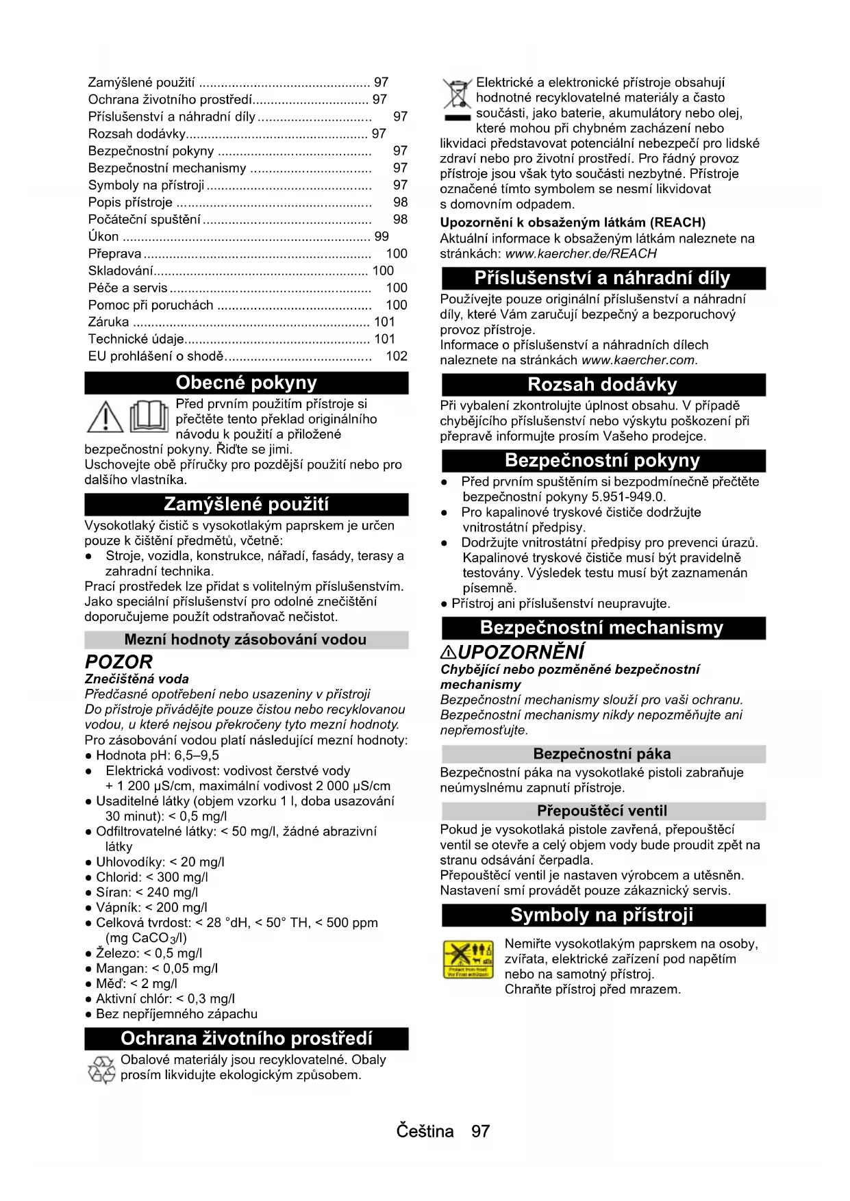 - /l) ● Železo: < 0,5 mg/l ● Mangan: < 0,05 mg/l ● Měď: < 2 mg/l ● Aktivní chlór: < 0,3 mg/l ● Bez nepříjemného zápachu Ochrana životního prostředí Obalové materiály jsou recyklovatelné. Obaly prosím likvidujte ekologickým způsobem. Elektrické a elektronické přístroje obsahují hodnotné recyklovatelné materiály a často součásti, jako baterie, akumulátory nebo olej, které mohou při chybném zacházení nebo likvidaci představovat potenciální nebezpečí pro lidské zdraví nebo pro životní prostředí. Pro řádný provoz přístroje jsou však tyto součásti nezbytné. Přístroje označené tímto symbolem se nesmí likvidovat s domovním odpadem. Upozornění k obsaženým látkám (REACH) Aktuální informace k obsaženým látkám naleznete na stránkách: www.kaercher.de/REACH Příslušenství a náhradní díly Používejte pouze originální příslušenství a náhradní díly, které Vám zaručují bezpečný a bezporuchový provoz přístroje. Informace o příslušenství a náhradních dílech naleznete na stránkách www.kaercher.com. Rozsah dodávky Při vybalení zkontrolujte úplnost obsahu. V případě chybějícího příslušenství nebo výskytu poškození při přepravě informujte prosím Vašeho prodejce. Bezpečnostní pokyny ● Před prvním spuštěním si bezpodmínečně přečtěte bezpečnostní pokyny 5.951-949.0. ● Pro kapalinové tryskové čističe dodržujte vnitrostátní předpisy. ● Dodržujte vnitrostátní předpisy pro prevenci úrazů. Kapalinové tryskové čističe musí být pravidelně testovány. Výsledek testu musí být zaznamenán písemně. ● Přístroj ani příslušenství neupravujte. Bezpečnostní mechanismy 몇 UPOZORNĚNÍ Chybějící nebo pozměněné bezpečnostní mechanismy Bezpečnostní mechanismy slouží pro vaši ochranu. Bezpečnostní mechanismy nikdy nepozměňujte ani nepřemosťujte. Bezpečnostní páka Bezpečnostní páka na vysokotlaké pistoli zabraňuje neúmyslnému zapnutí přístroje. Přepouštěcí ventil Pokud je vysokotlaká pistole zavřená, přepouštěcí ventil se otevře a celý objem vody bude proudit zpět na stranu odsávání čerpadla. Přepouštěcí ventil je nastaven výrobcem a utěsněn. Nastavení smí provádět pouze zákaznický servis. Symboly na přístroji Zamýšlené použití p. 97