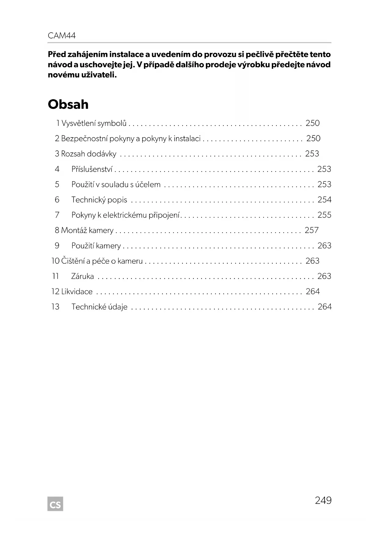 - Před zahájením instalace a uvedením do provozu si pečlivě přečtěte tento návod a uschovejte jej. V případě dalšího prodeje výrobku předejte návod novému uživateli. Obsah 1 Vysvětlení symbolů p. 250