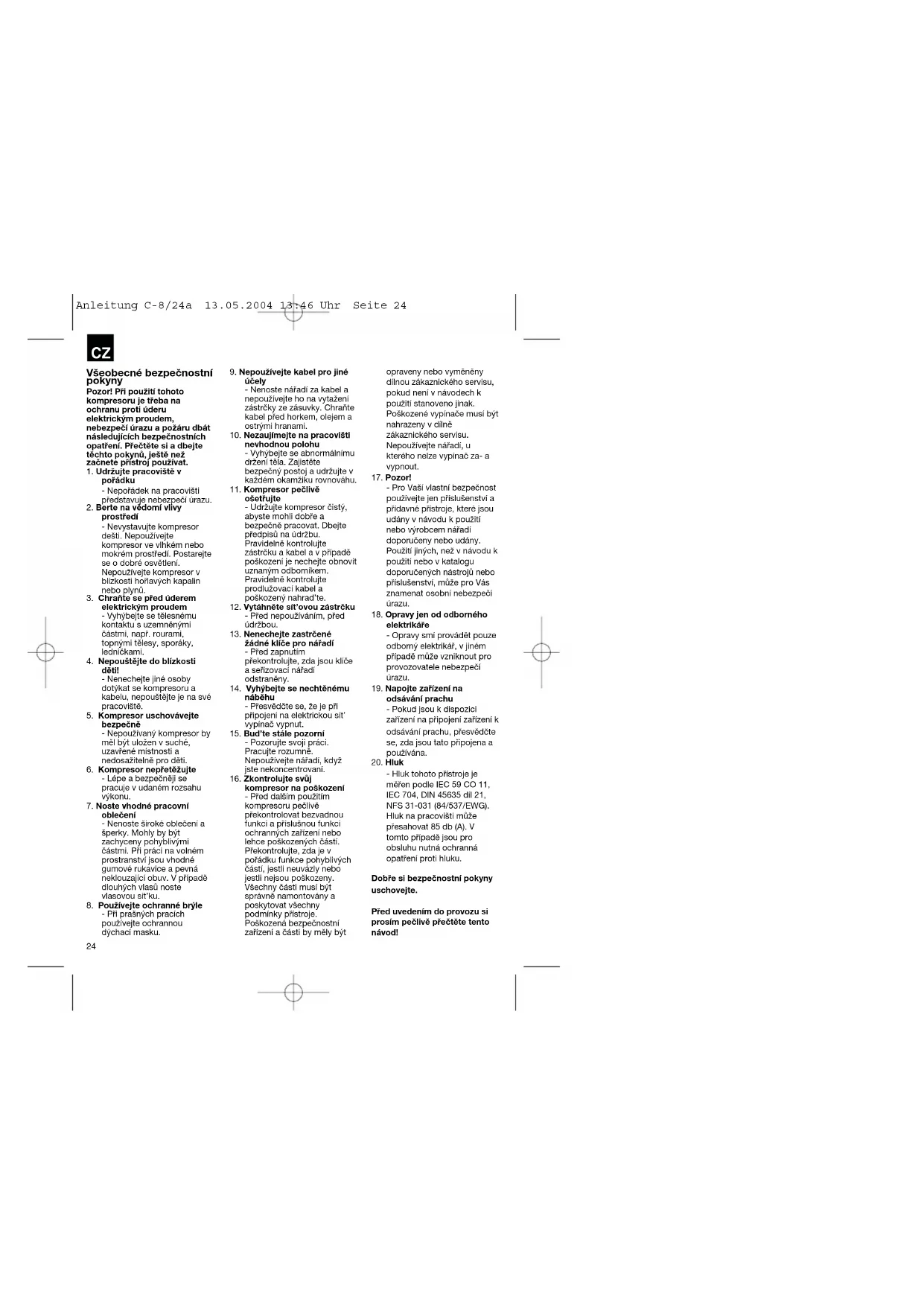 Anleitung C-8/24a 13.05.2004 13:46 Uhr Seite 2324 Všeobecné bezpečnostní pokyny Pozor! Při použití tohoto kompresoru je třeba na ochranu proti úderu elektrickým proudem, nebezpečí úrazu a požáru dbát následujících bezpečnostních opatření. Přečtěte si a dbejte těchto pokynů, ještě než začnete přístroj používat.