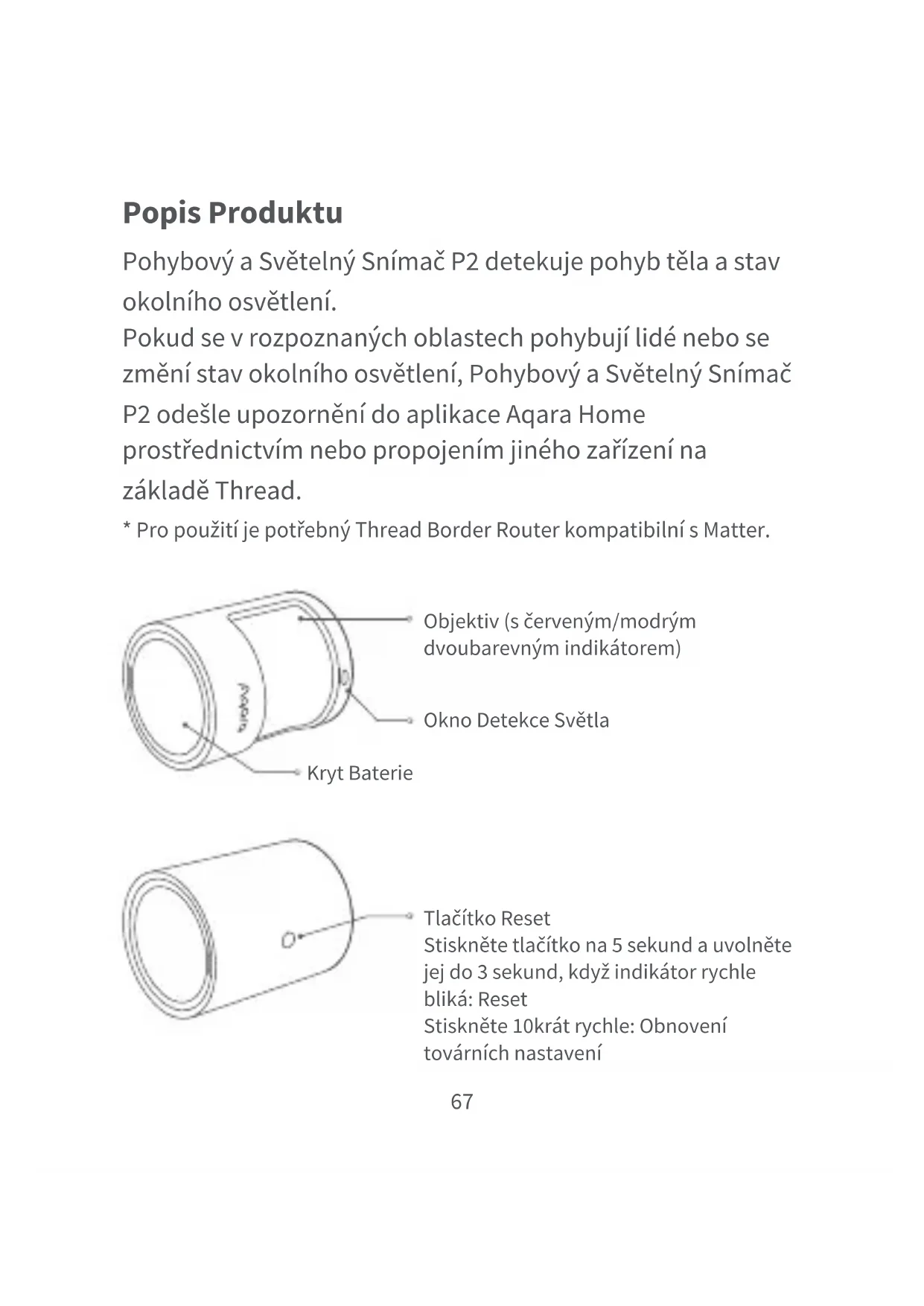 Při běžném používání tohoto zařízení by měla být vzdálenost mezi anténou a tělem uživatele minimálně 20 cm.* Na použitie je potrebný Thread Border Router kompatibilný s Matter. Pohybový a Svetelný Snímač P2 detekuje pohyb tela a stav okolitého osvetlenia. Ak sa v rozpoznaných oblastiach pohybujú ľudia alebo sa zmení stav okolitého osvetlenia, Pohybový a Svetelný Snímač P2 odošle upozornenie do aplikácie Aqara Home prostredníctvom alebo prepojením iného zariadenia na základe Thread. Popis produktu Tlačidlo Reset Stlačte tlačidlo na 5 sekúnd a uvoľnite ho do 3 sekúnd, keď indikátor rýchlo bliká: Reset Stlačte 10-krát rýchlo: Obnovenie továrenských nastavení Objektív (s červeným/modrým dvojfarebným indikátorom) Okno Detekcie Svetla Kryt Batérie