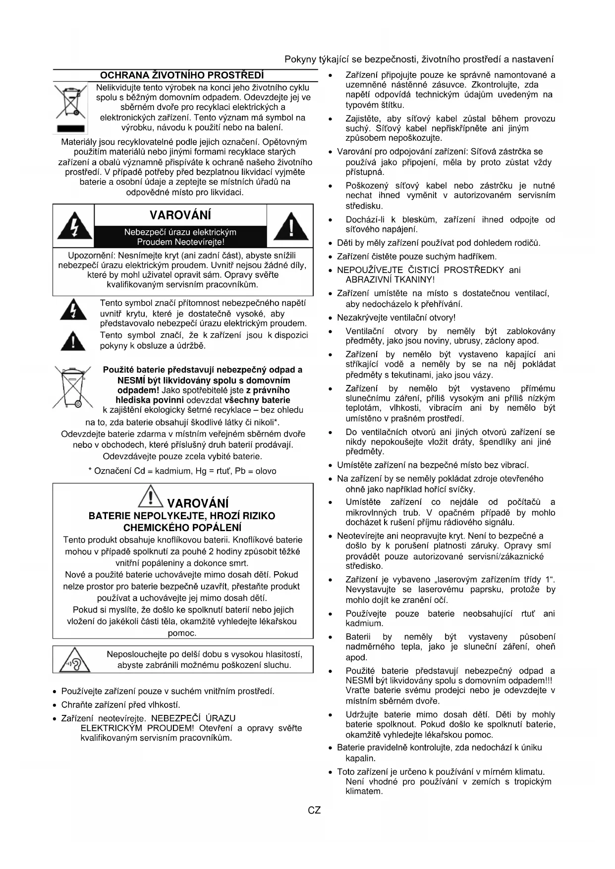 - Zařízení neotevírejte. NEBEZPEČÍ ÚRAZU ELEKTRICKÝM PROUDEM! Otevření a opravy svěřte kvalifikovaným servisním pracovníkům.