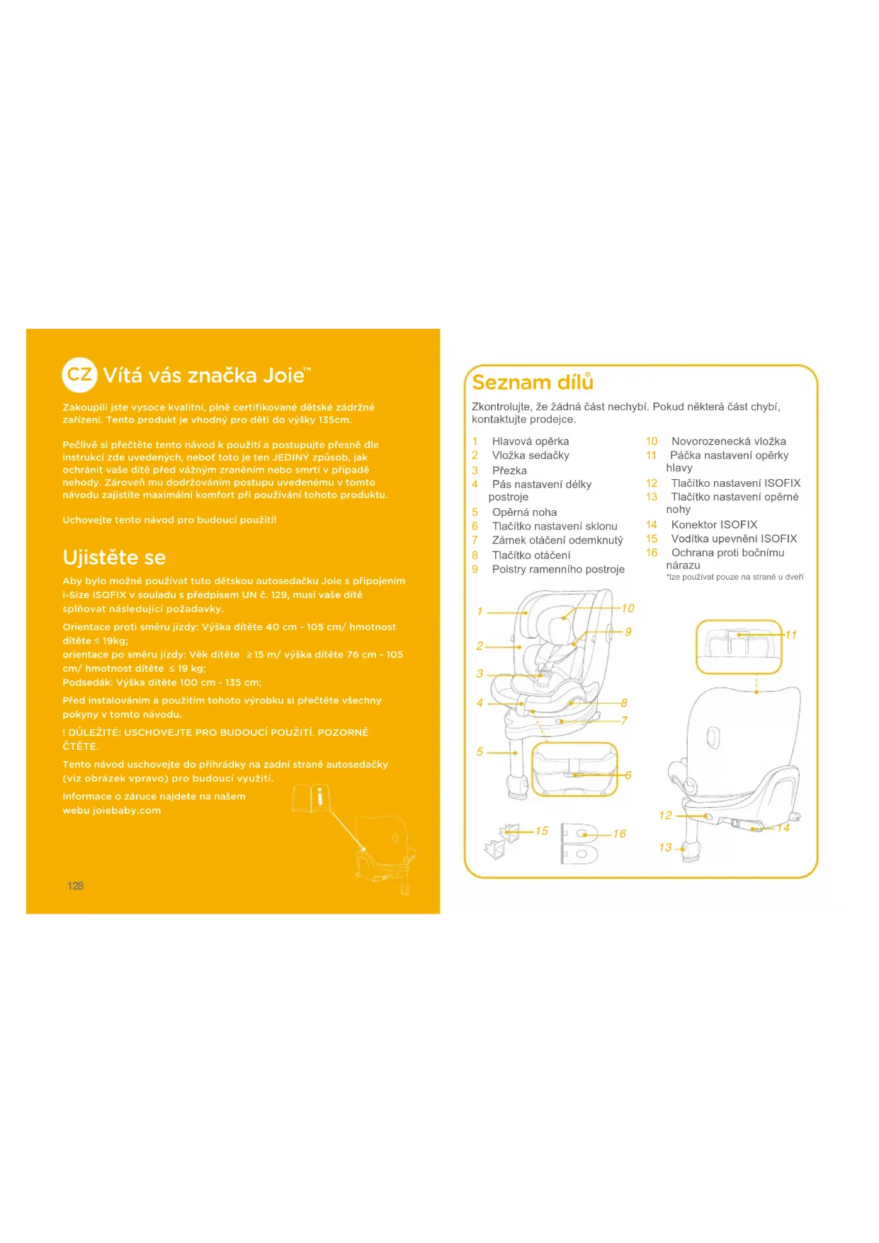 Zakoupili jste vysoce kvalitní﹐ plně certifikované dětské zádržné zařízení. Tento produkt je vhodný pro děti do výšky 135cm.Pečlivě si přečtěte tento návod k použití a postupujte přesně dle instrukcí zde uvedených﹐ neboť toto je ten JEDINÝ způsob﹐ jak ochránit vaše dítě před vážným zraněním nebo smrtí v případě nehody. Zároveň mu dodržováním postupu uvedenému v tomto návodu zajistíte maximální komfort při používání tohoto produktu.Uchovejte tento návod pro budoucí použití! Ujistěte se Aby bylo možné používat tuto dětskou autosedačku Joie s připojením i-Size ISOFIX v souladu s předpisem UN č. 129﹐ musí vaše dítě splňovat následující požadavky.Orientace proti směru jízdy: Výška dítěte 40 cm - 105 cm/ hmotnost dítěte 19kg; orientace po směru jízdy: Věk dítěte 15 m/ výška dítěte 76 cm - 105 cm/ hmotnost dítěte 19 kg; Podsedák: Výška dítěte 100 cm - 135 cm;Před instalováním a použitím tohoto výrobku si přečtěte všechny pokyny v tomto návodu.! DŮLEŽITÉ: USCHOVEJTE PRO BUDOUCÍ POUŽITÍ. POZORNĚ ČTĚTE.Tento návod uschovejte do přihrádky na zadní straně autosedačky (viz obrázek vpravo) pro budoucí využití. Informace o záruce najdete na našem webu joiebaby.com Seznam dílů 1 Hlavováopěrka2 Vložkasedačky3 Přezka4 Pásnastavenídélkypostroje5 Opěrnánoha6 Tlačítkonastavenísklonu7 Zámekotáčeníodemknutý8 Tlačítkootáčení9 Polstryramenníhopostroje10 Novorozeneckávložka11 Páčkanastaveníopěrkyhlavy12 TlačítkonastaveníISOFIX13 Tlačítkonastaveníopěrné nohy 14 KonektorISOFIX15 VodítkaupevněníISOFIX16 Ochranaprotibočnímunárazu*lzepoužívatpouzenastraněudveříZkontrolujte,žežádnáčástnechybí.Pokudněkteráčástchybí,kontaktujteprodejce.